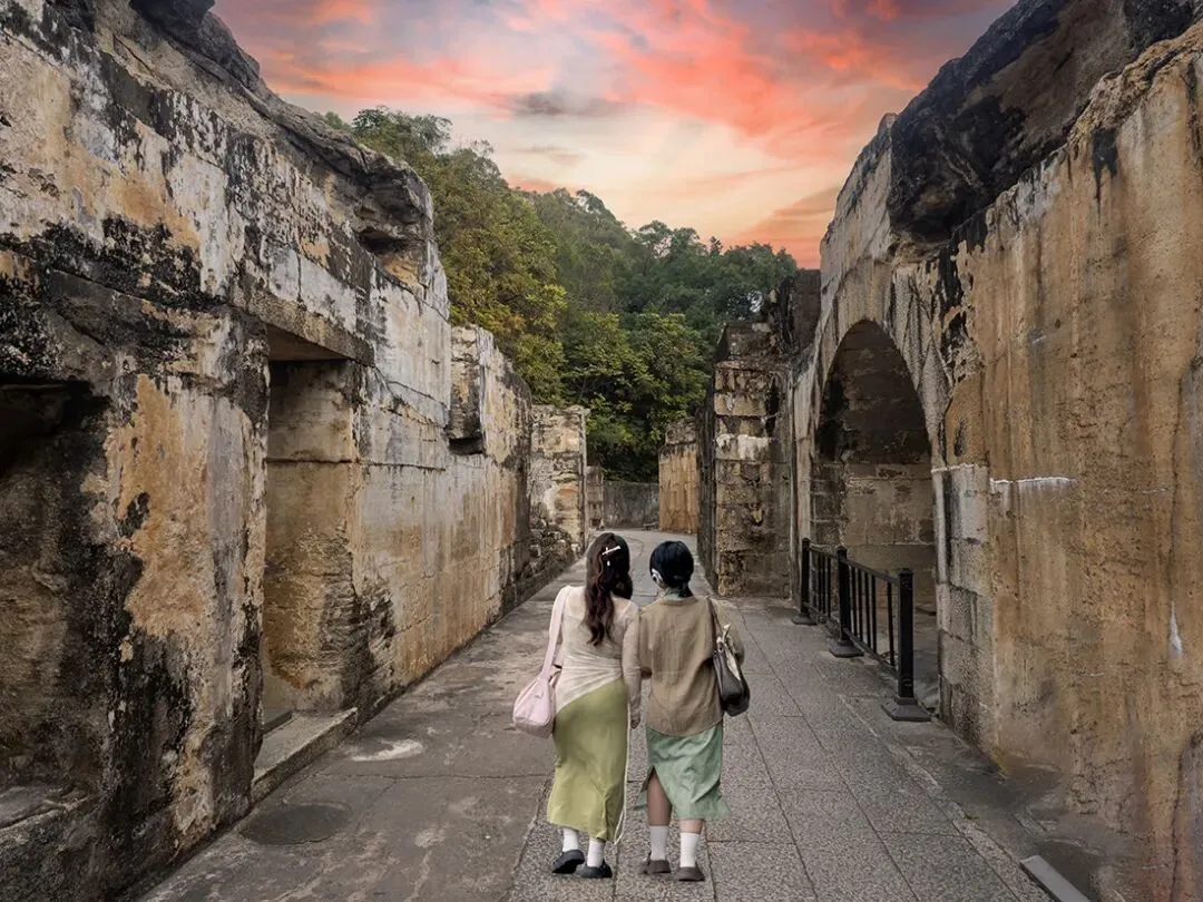 沙角主炮台、捕鱼台、临高台等炮台错落分布、首尾呼应,条石与灰砂糯米浆砌筑的炮身,历经百年风雨侵蚀与海浪冲刷,依旧坚固挺拔、屹立不倒,尽显岁月的坚韧。