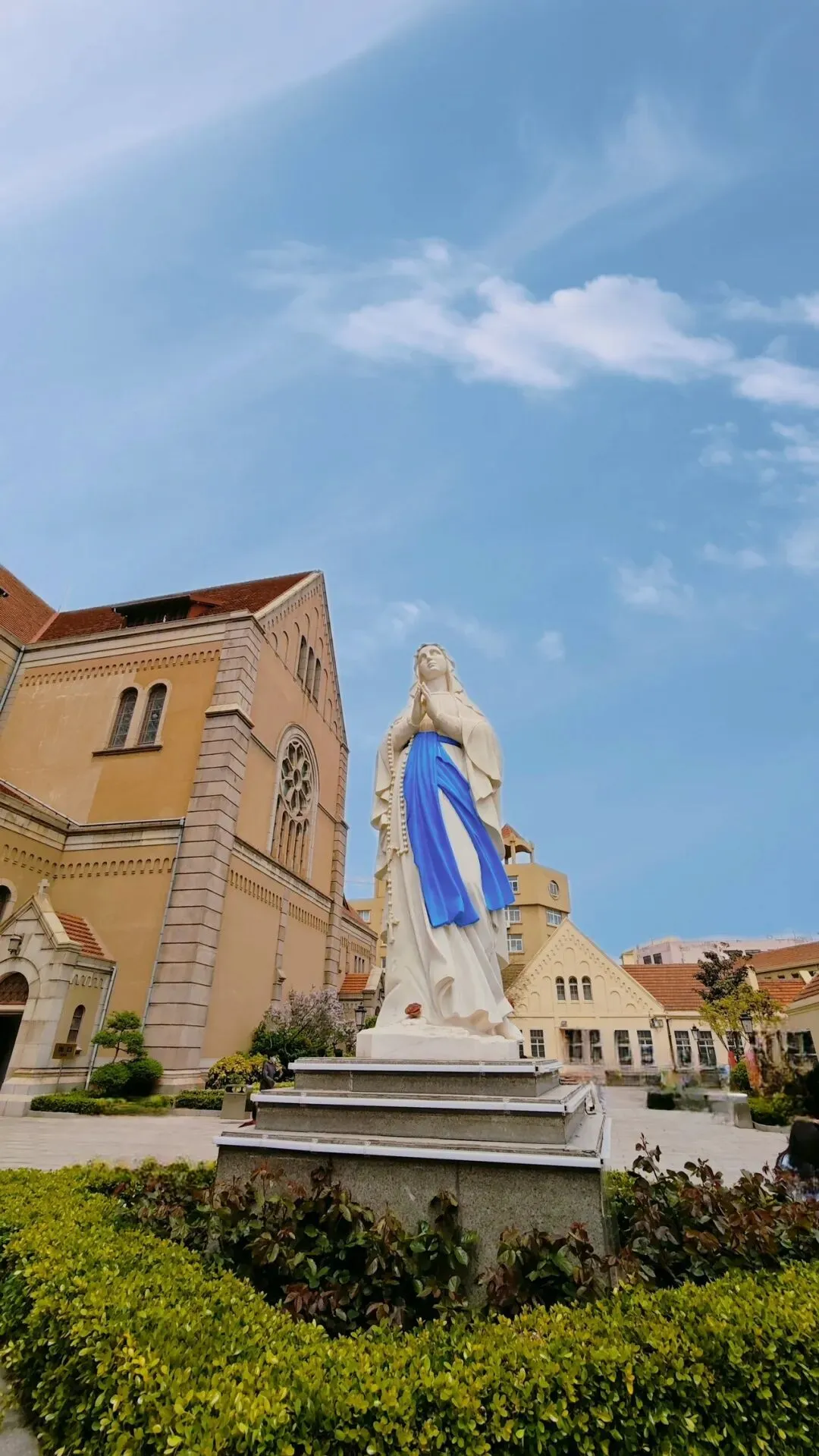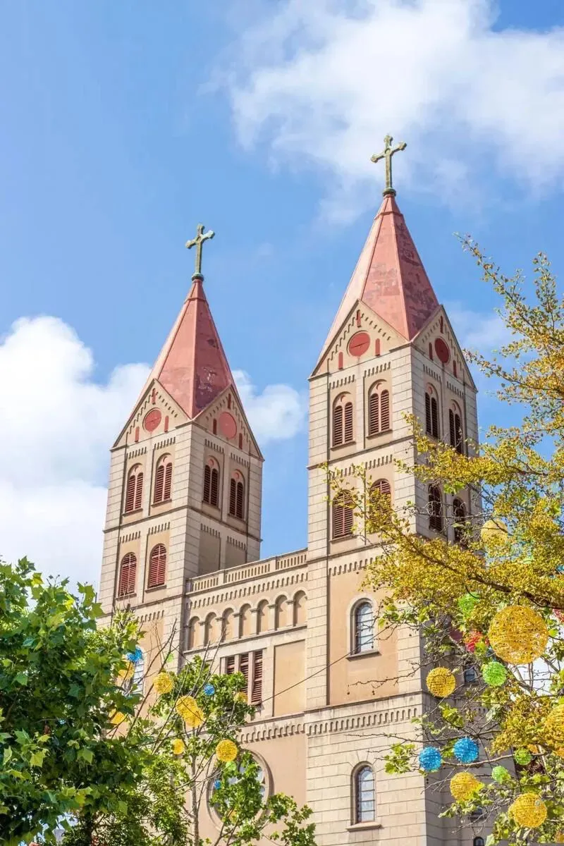 4.圣弥厄尔教堂:天主教堂,原称圣弥厄尔大教堂,始建于民国二十一年(1932年),由德国设计师毕娄哈依据哥特式和罗马式建筑风格而设计,民国二十三年(1934年)10月落成。总占地11480平方米。天主教堂平面呈十字形,教堂主体两翼,各耸一座尖塔,塔高56米,顶端各立有一个4.5米高的巨型十字架。大厅高18米,可纳千人,内部采用意大利文艺复兴时期的装饰,穹顶绘以圣像壁画。天主教堂是青岛地区最大的天主教堂和哥特式建筑,也是中国唯一的祝圣教堂。