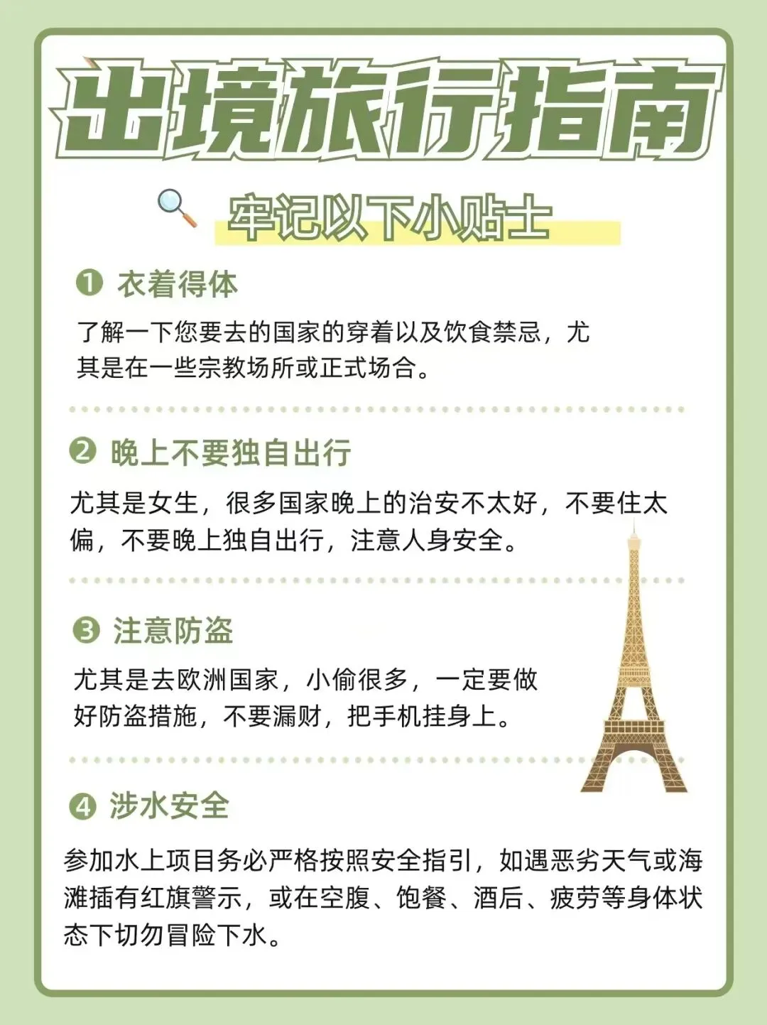 2.晚上不要独自出行其是女生,很多国家晚上的治安不太好,不要住太偏,不要晚上独自出行,注意人身安全。