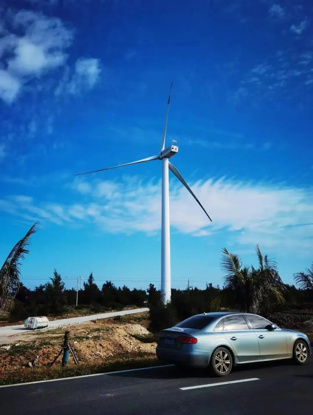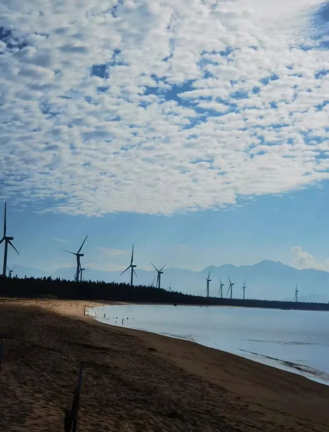第一站,便是无数人心中的浪漫秘境——鱼鳞洲风车海岸,巨大的白色风车静静矗立海边。