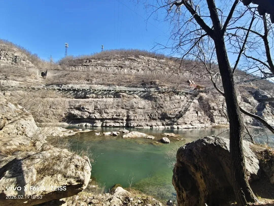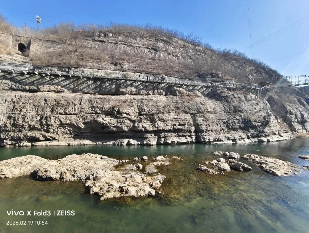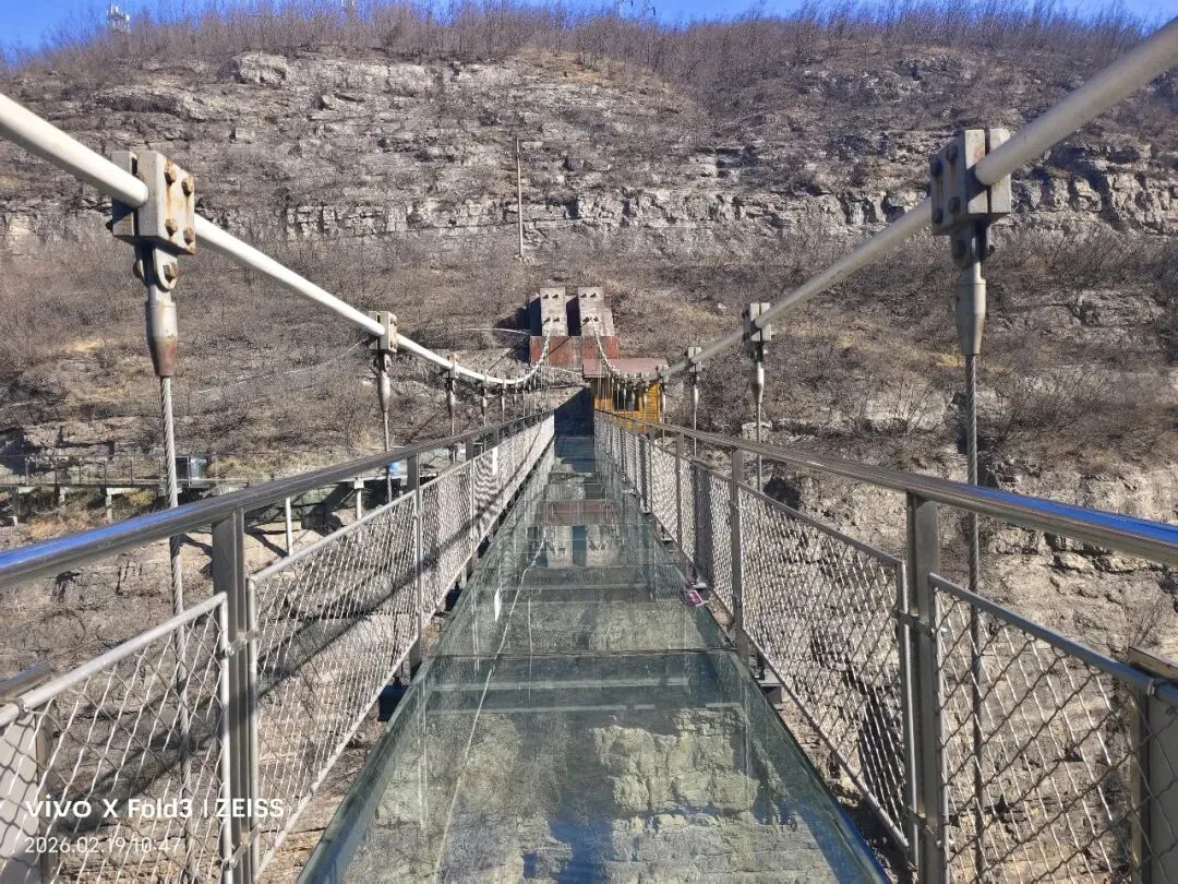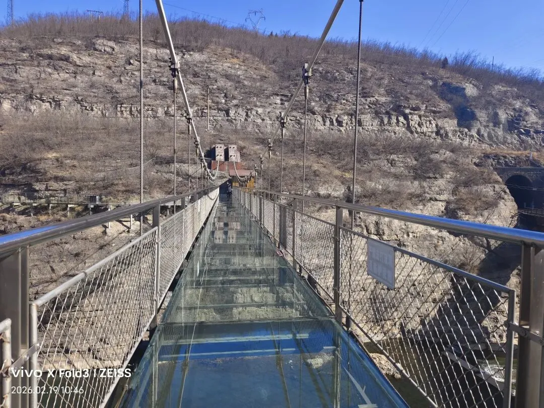 绵河大桥不远处有一座玻璃观光吊桥。沿着台阶登上桥台,一座玻璃吊桥就出现在眼前。顺着吊桥可以到河的另一侧,沿着悬崖有一条玻璃栈道向前延伸,也能通往水帘洞瀑布。我们没有过去,在吊桥上走了一半就返回了。站在吊桥的中间向远处观望,东侧是横亘于绵河上的两座铁路桥,在不同时期发挥着同样的作用,阳光照射在浅浅的水面上,散发着粼粼波光。向西望去,两侧是不同的两个栈道,右侧是山脚下的木栈道,左侧是山体中间的玻璃栈道,都随着山体蜿蜒向前。河水清浅,河床的乱石凸出水面,呈白色,在周边的景色中,就有些显眼。