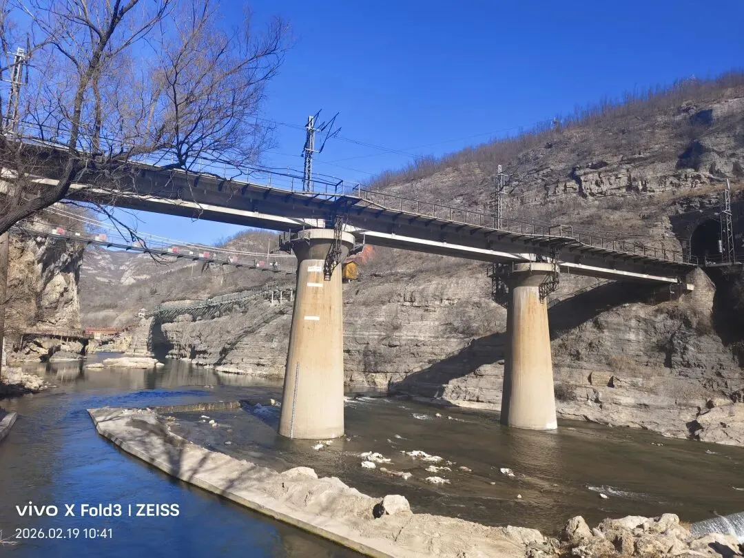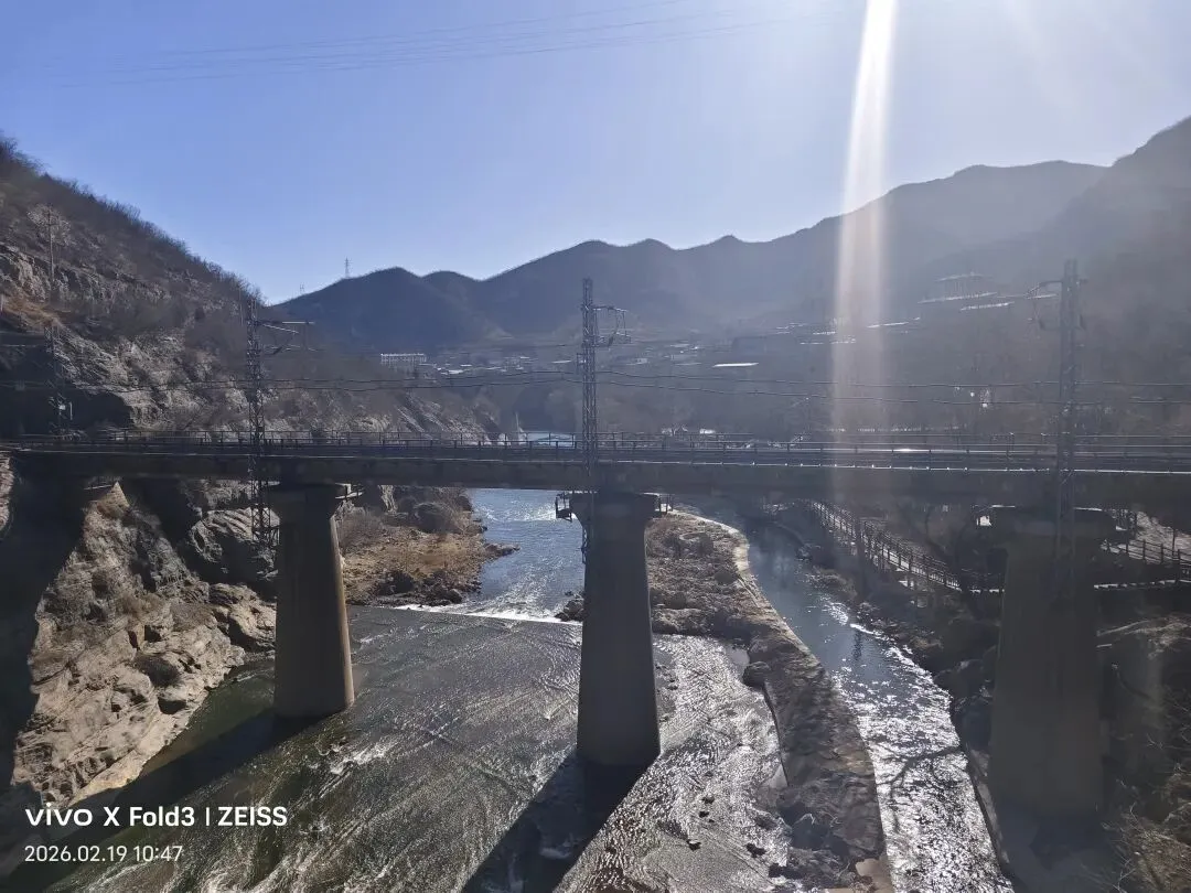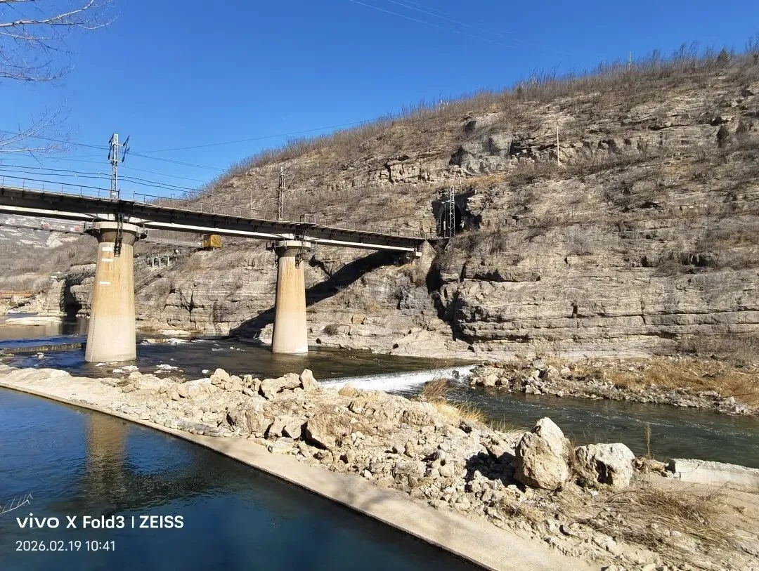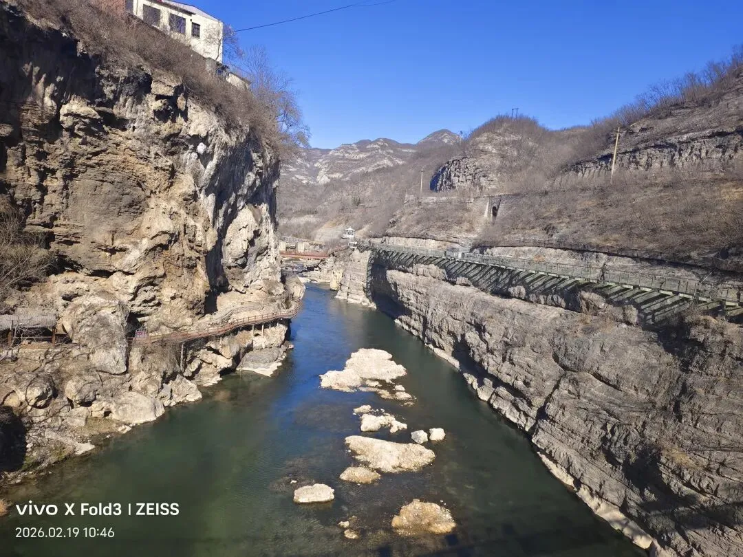 绵河大桥不远处有一座玻璃观光吊桥。沿着台阶登上桥台,一座玻璃吊桥就出现在眼前。顺着吊桥可以到河的另一侧,沿着悬崖有一条玻璃栈道向前延伸,也能通往水帘洞瀑布。我们没有过去,在吊桥上走了一半就返回了。站在吊桥的中间向远处观望,东侧是横亘于绵河上的两座铁路桥,在不同时期发挥着同样的作用,阳光照射在浅浅的水面上,散发着粼粼波光。向西望去,两侧是不同的两个栈道,右侧是山脚下的木栈道,左侧是山体中间的玻璃栈道,都随着山体蜿蜒向前。河水清浅,河床的乱石凸出水面,呈白色,在周边的景色中,就有些显眼。