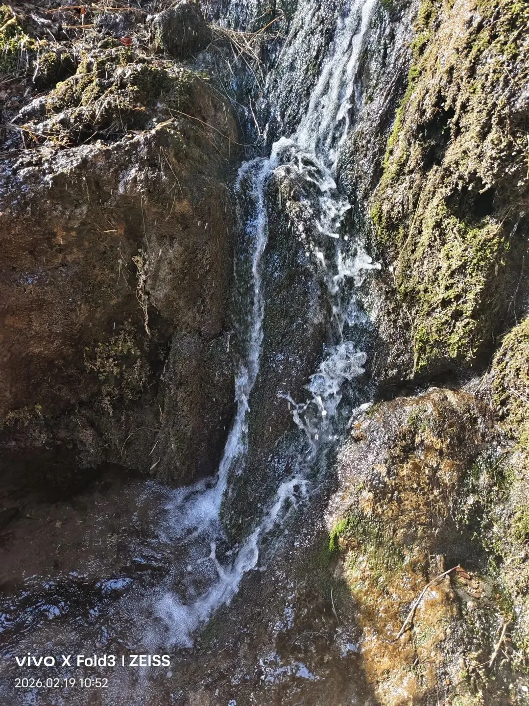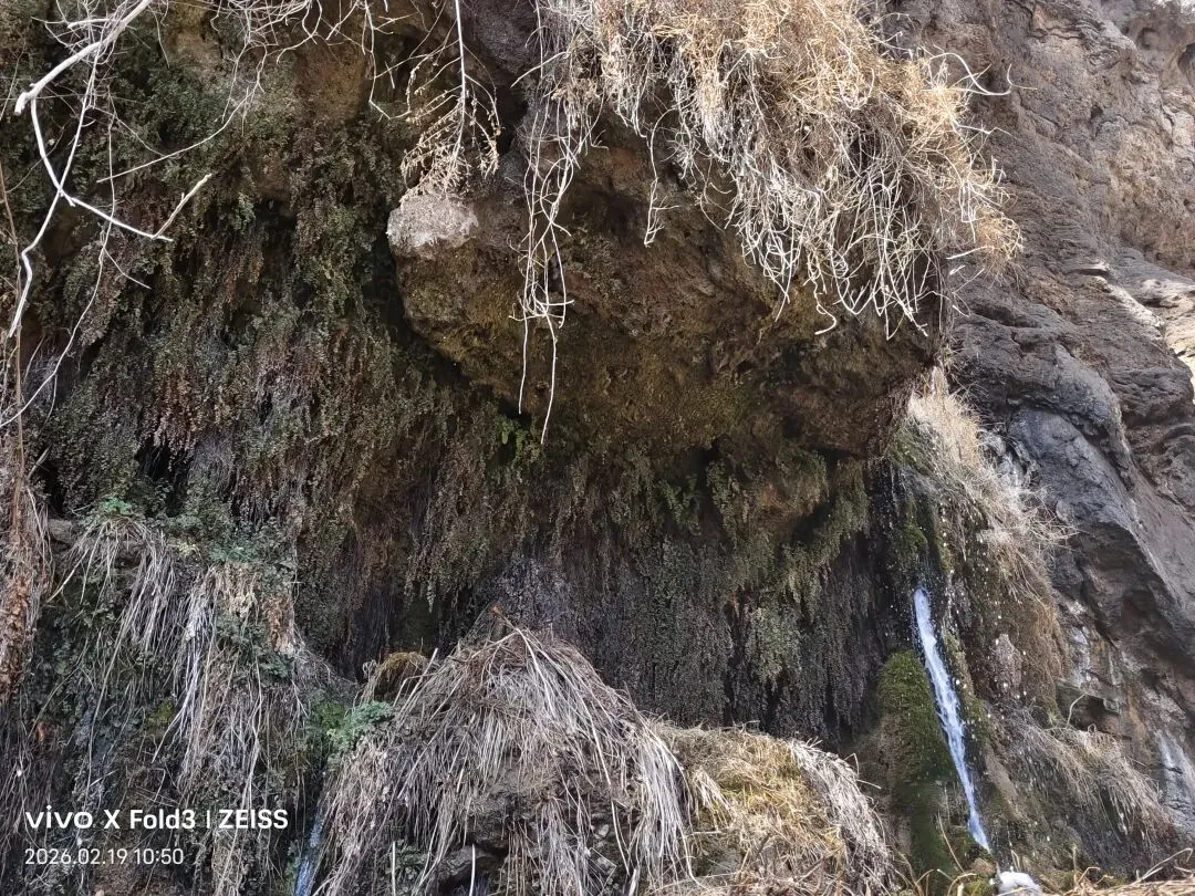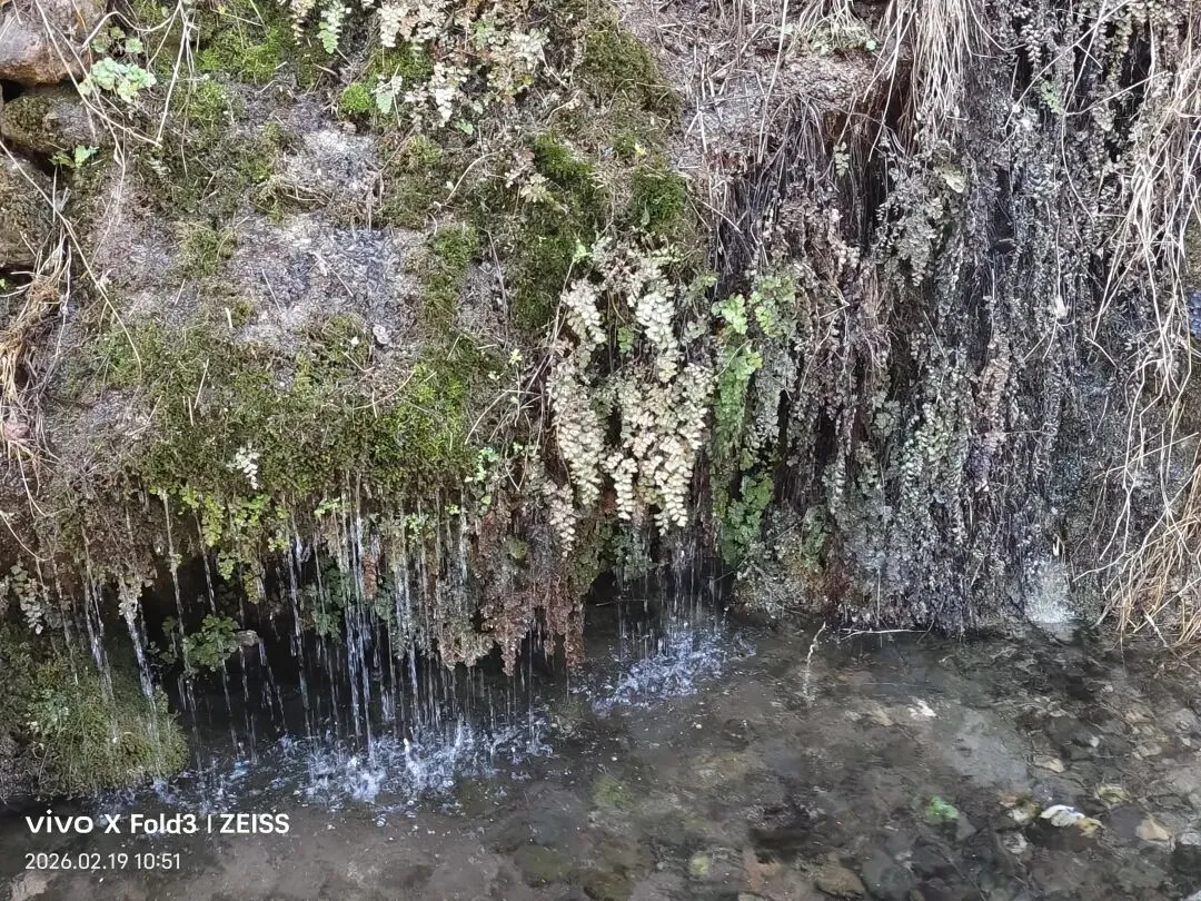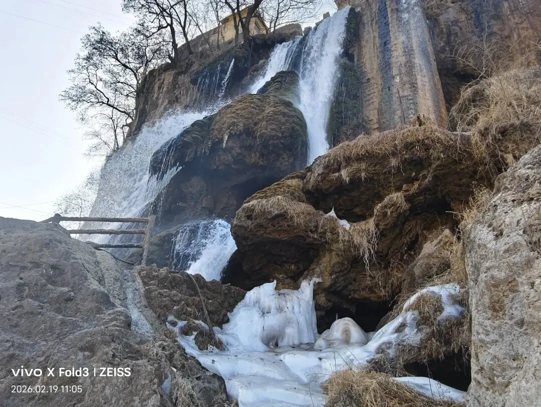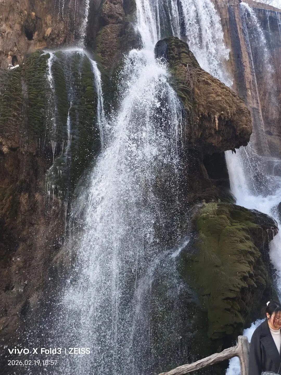 从玻璃吊桥下来后,继续沿着木栈道向前,水流变得多而密集。山体的凹陷处苔藓水草密布。冬日里,这些绿色就显得很鲜见。也有冰凌挂在外面的岩石上,晶莹剔透。冰与水共存,绿色在一片枯黄中点缀,荒芜与生机并行。有水流激荡的声音传来,前面就是水帘洞瀑布了,这是一处非常值得观看的景点。