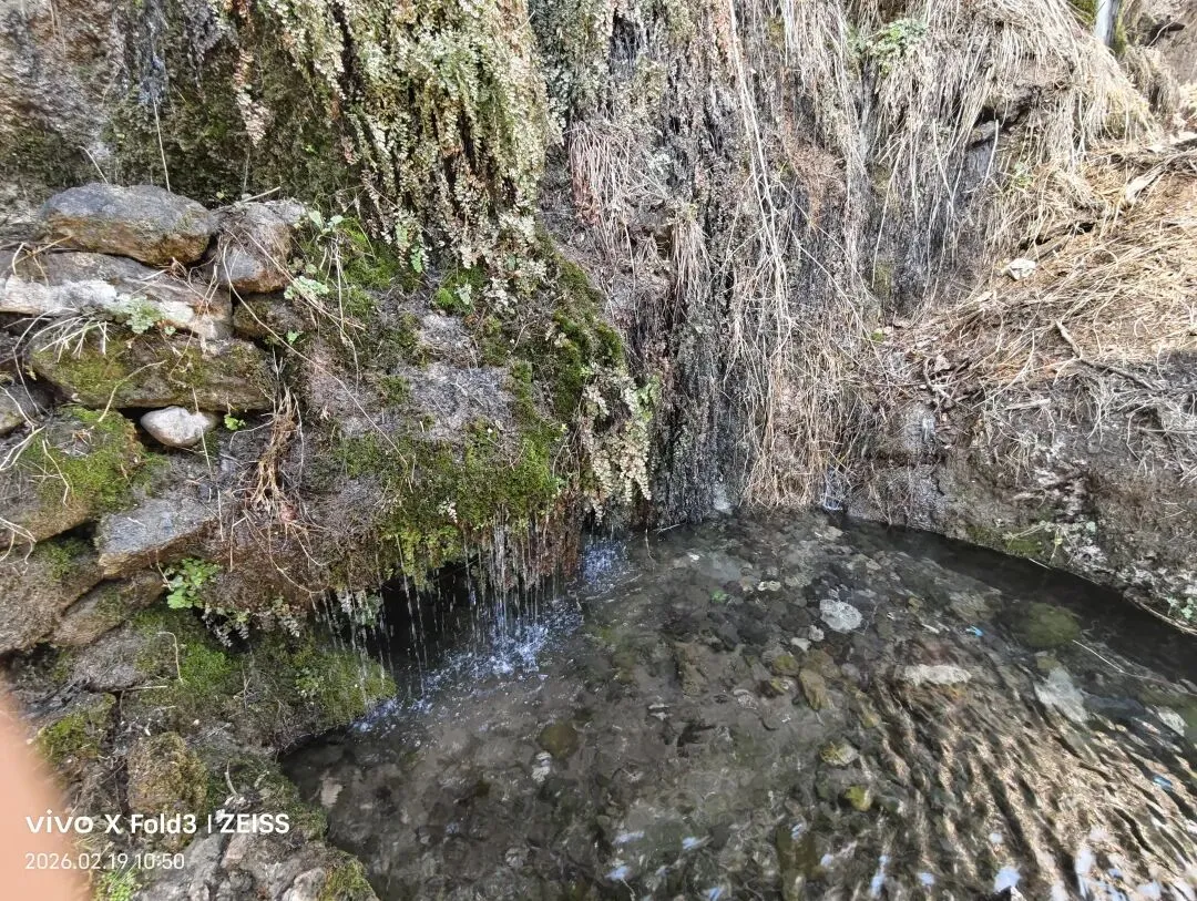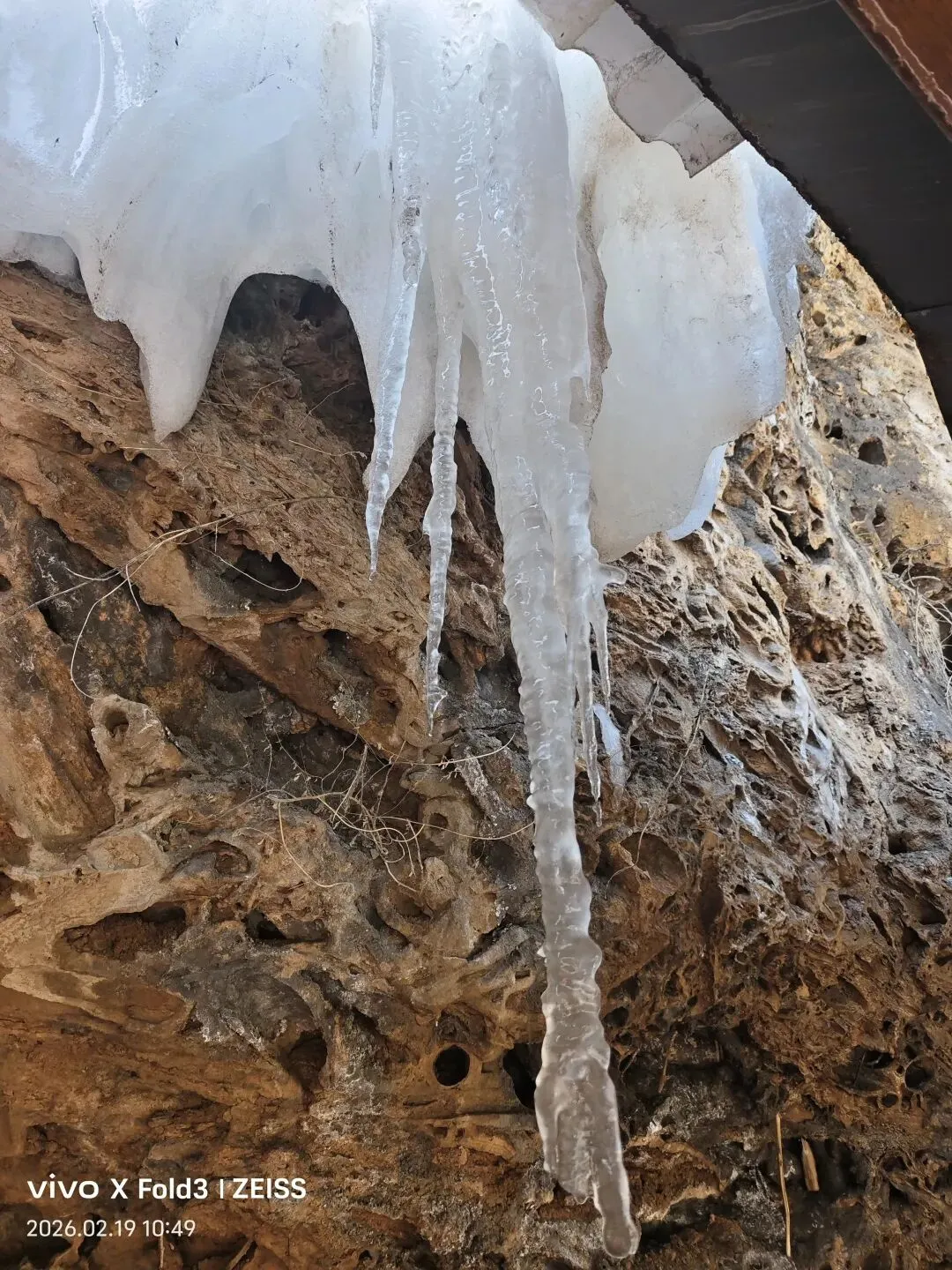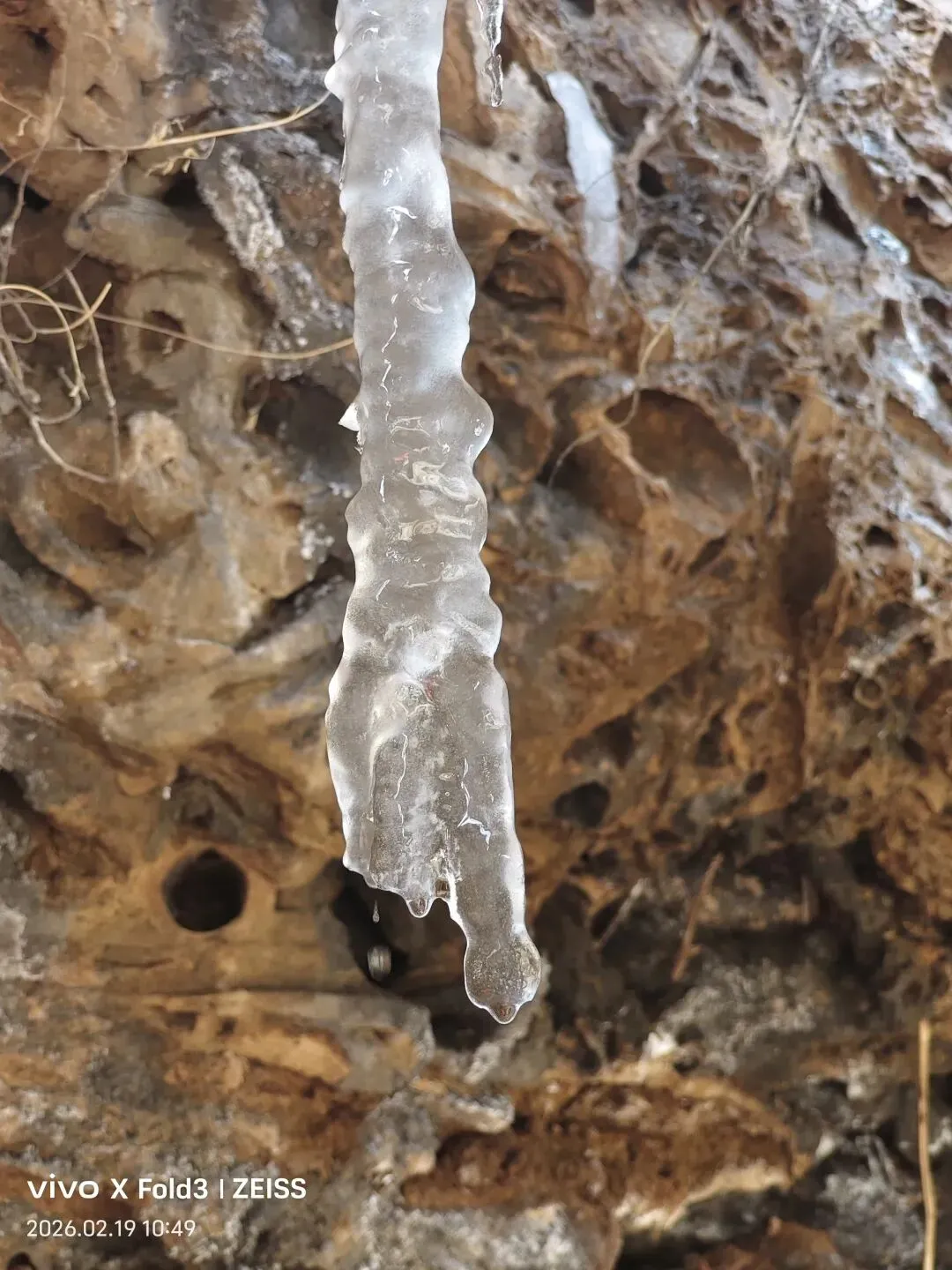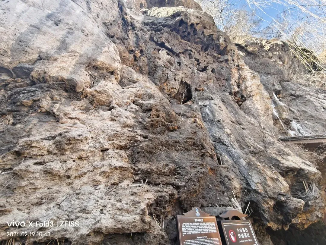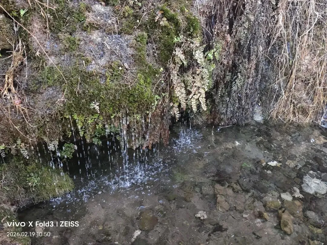 从玻璃吊桥下来后,继续沿着木栈道向前,水流变得多而密集。山体的凹陷处苔藓水草密布。冬日里,这些绿色就显得很鲜见。也有冰凌挂在外面的岩石上,晶莹剔透。冰与水共存,绿色在一片枯黄中点缀,荒芜与生机并行。有水流激荡的声音传来,前面就是水帘洞瀑布了,这是一处非常值得观看的景点。