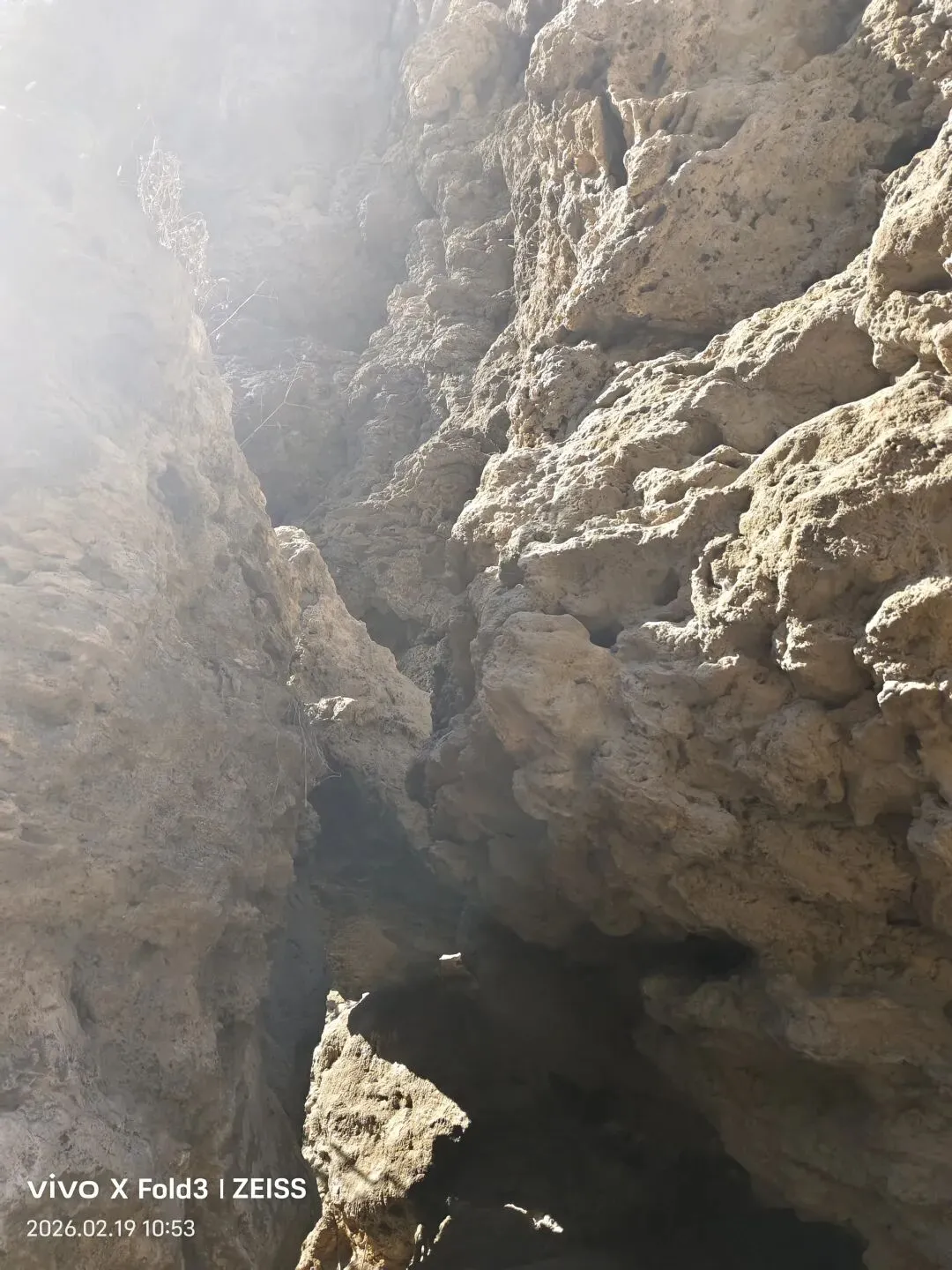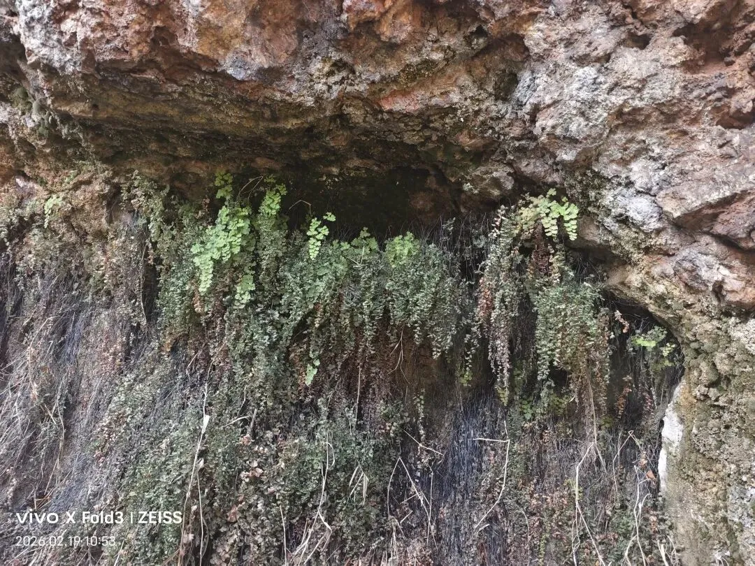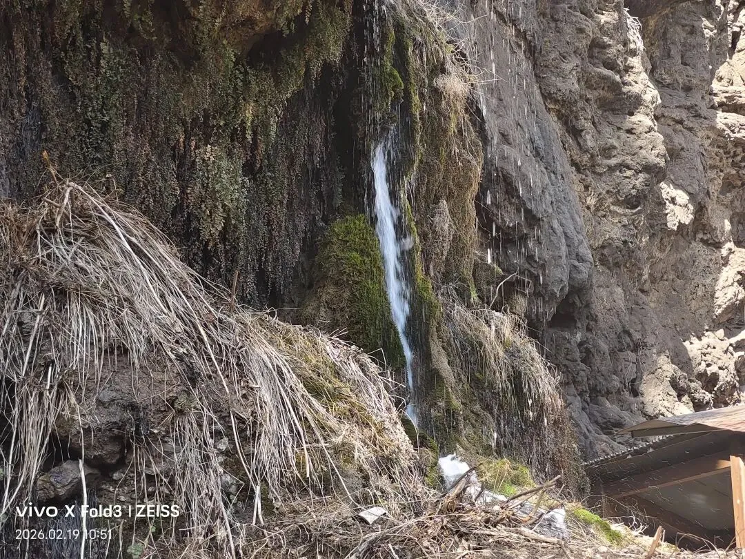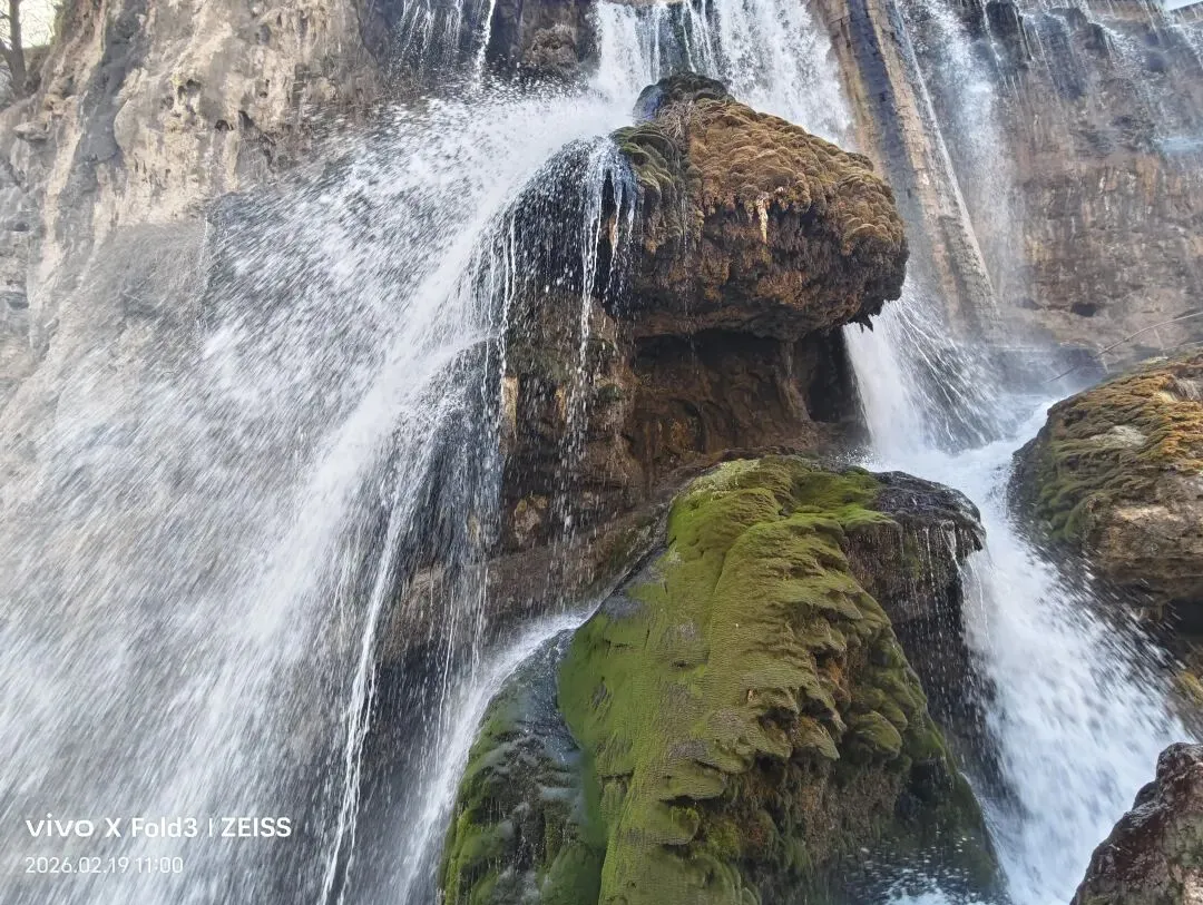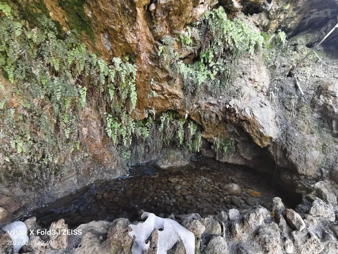 从玻璃吊桥下来后,继续沿着木栈道向前,水流变得多而密集。山体的凹陷处苔藓水草密布。冬日里,这些绿色就显得很鲜见。也有冰凌挂在外面的岩石上,晶莹剔透。冰与水共存,绿色在一片枯黄中点缀,荒芜与生机并行。有水流激荡的声音传来,前面就是水帘洞瀑布了,这是一处非常值得观看的景点。