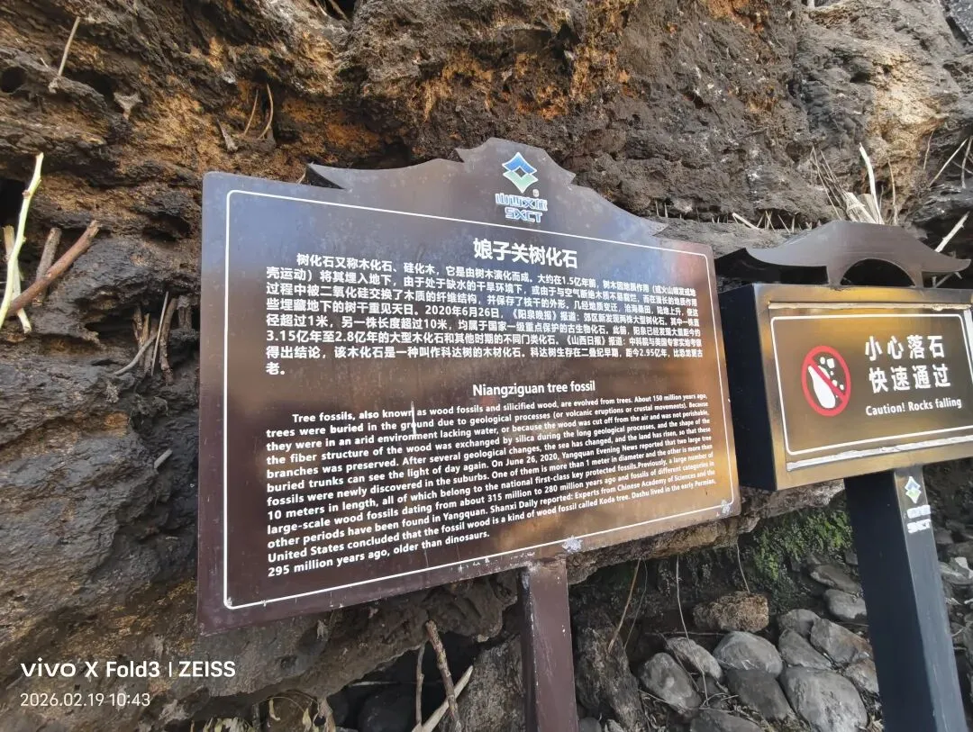 过了铁路石拱桥,就到了平阳湖另一侧码头。一座现代化的铁路桥横亘在绵河上,为石太铁路绵河大桥,正在承担者晋煤外运和客货运输的任务。栈道的一侧有一处树化石,由亿万年前的树木演化而来,在漫长的岁月中,渐渐的由二氧化硅代替了木质纤维,保留了树干的形状,这是标牌上的说明,想象力贫乏的我是真的看不出来树木的形状,但是想一想这里有着亿万年的沉淀,还是很有沧桑感的。