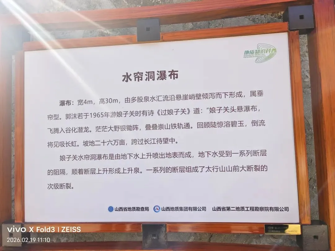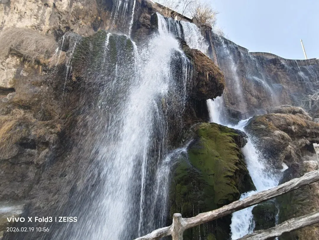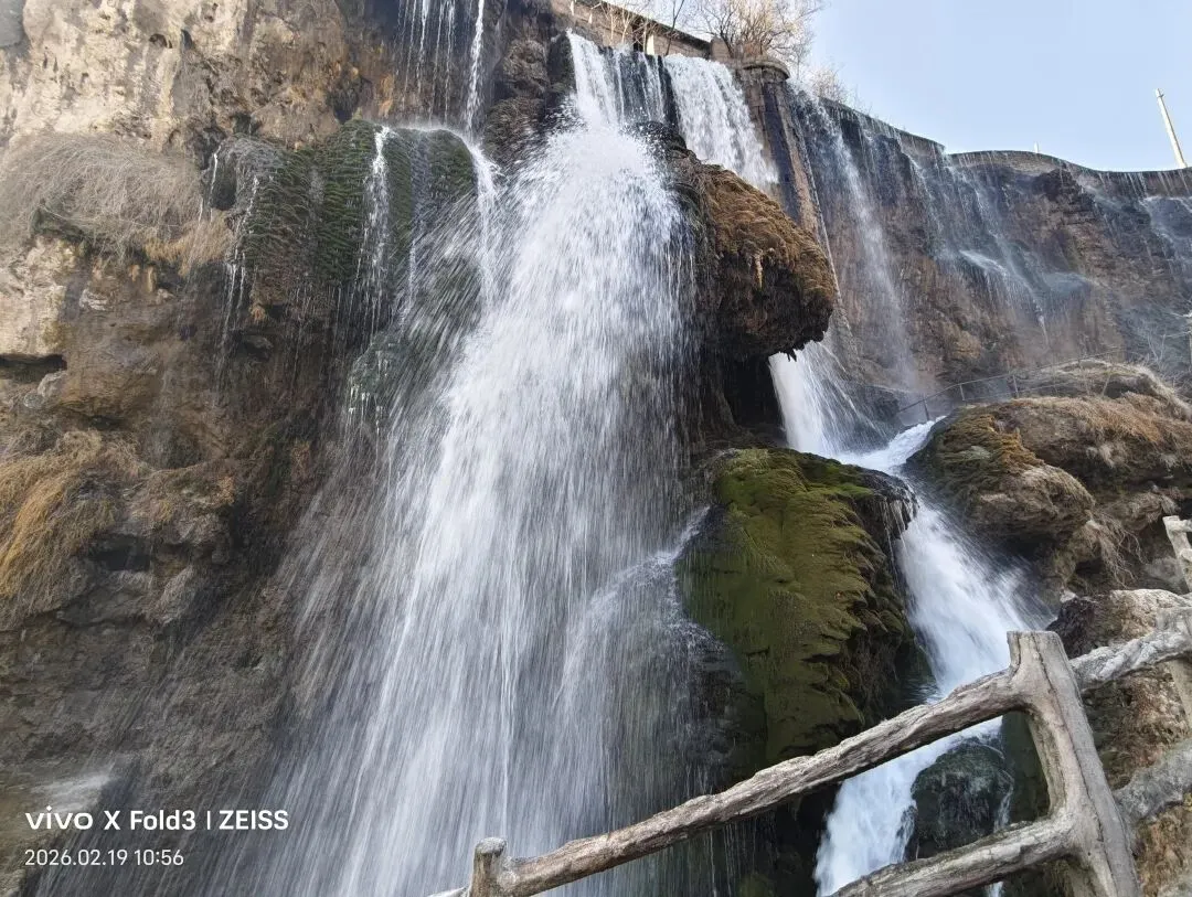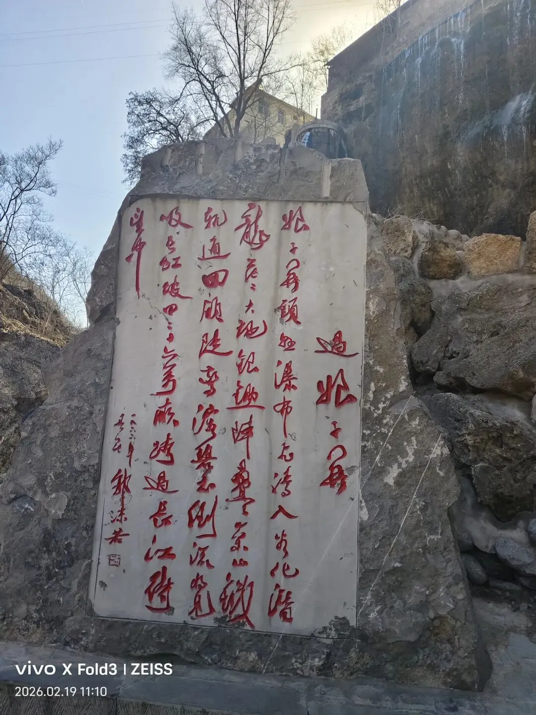 瀑布的另外一侧,未经水流冲刷的地方形成冰凌,堆积在石块下方。这里有一块石碑,刻着郭沫若游娘子关是所写的诗作。诗句中描写的群山叠叠,瀑布像潜龙,湖水如碧玉,还有承载石拱桥上的铁轨,就是平阳湖和瀑布两个景区的看点。在瀑布附近还看到两处泉眼,名曰“滚泉”,水流从泉眼冒出来,在水面翻滚,周边就泛起微波,泉水很清澈,水底的青苔历历在目。娘子关景区的水质还是非常好的。