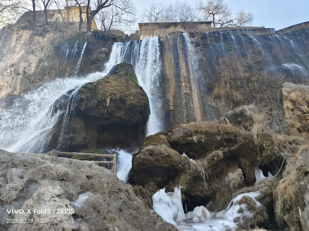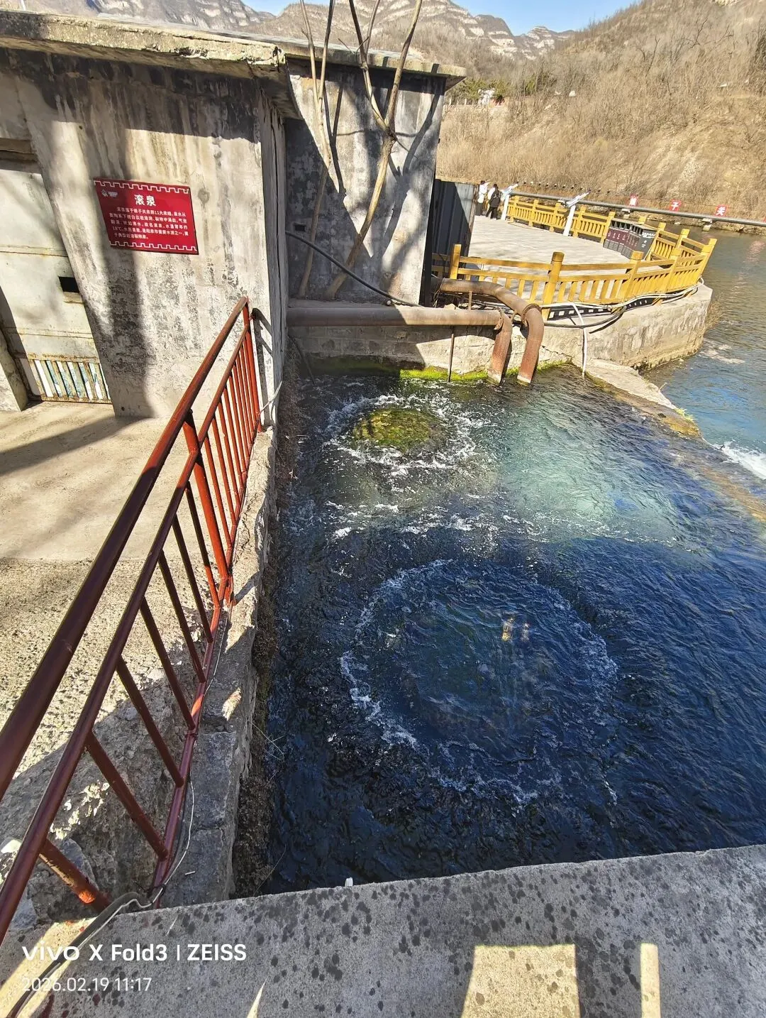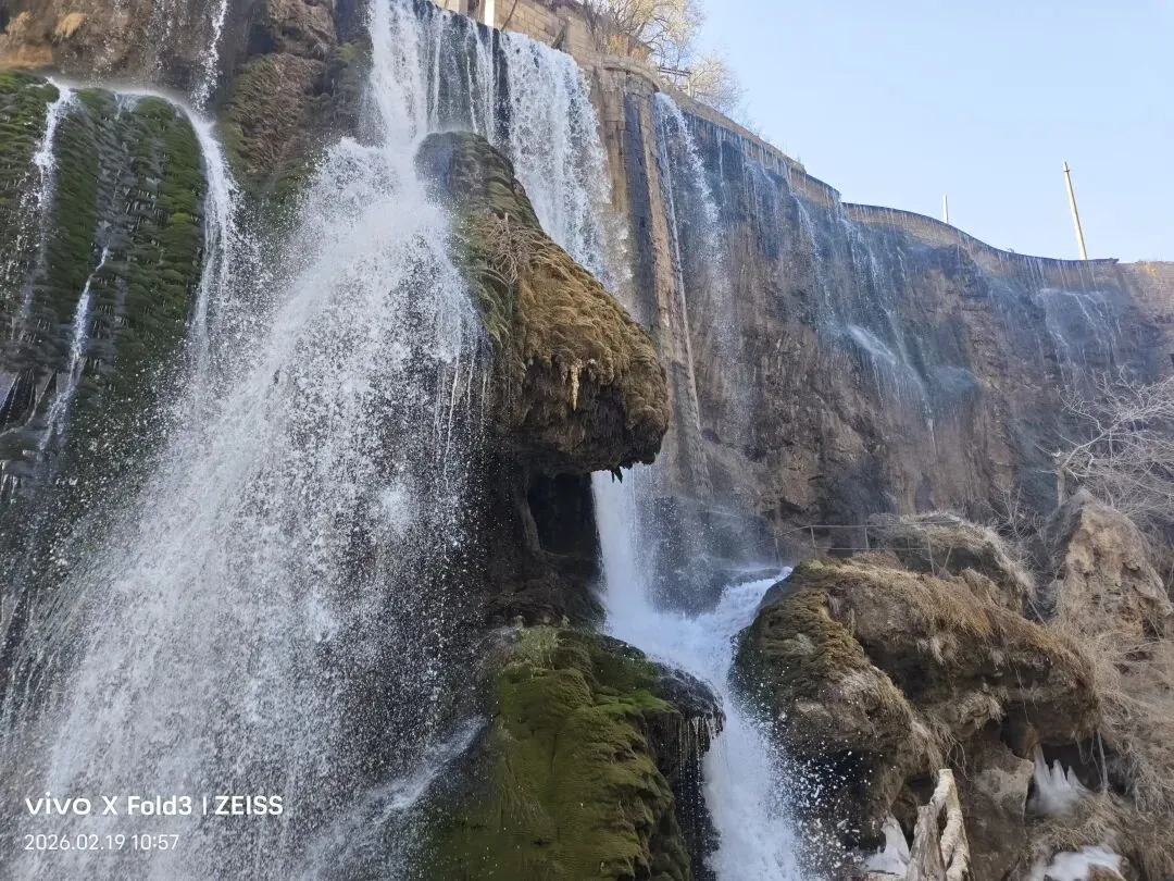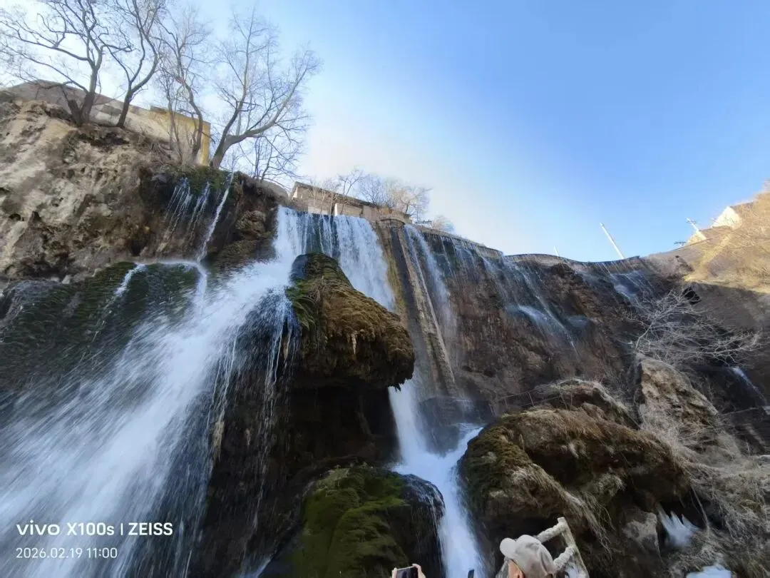 瀑布的另外一侧,未经水流冲刷的地方形成冰凌,堆积在石块下方。这里有一块石碑,刻着郭沫若游娘子关是所写的诗作。诗句中描写的群山叠叠,瀑布像潜龙,湖水如碧玉,还有承载石拱桥上的铁轨,就是平阳湖和瀑布两个景区的看点。在瀑布附近还看到两处泉眼,名曰“滚泉”,水流从泉眼冒出来,在水面翻滚,周边就泛起微波,泉水很清澈,水底的青苔历历在目。娘子关景区的水质还是非常好的。
