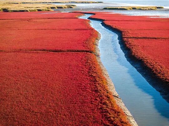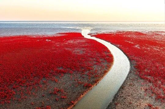 ❸ 盘锦红海滩(辽宁) “9月火焰海岸!碱蓬草染红天际,穿白裙子拍照直接封神📸” ▫️ 💰门票80-120元 | 9-10月限定