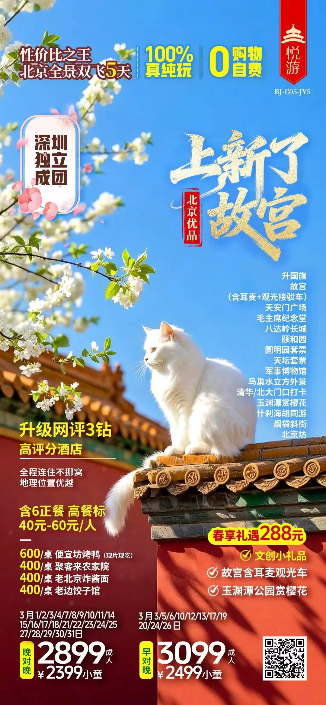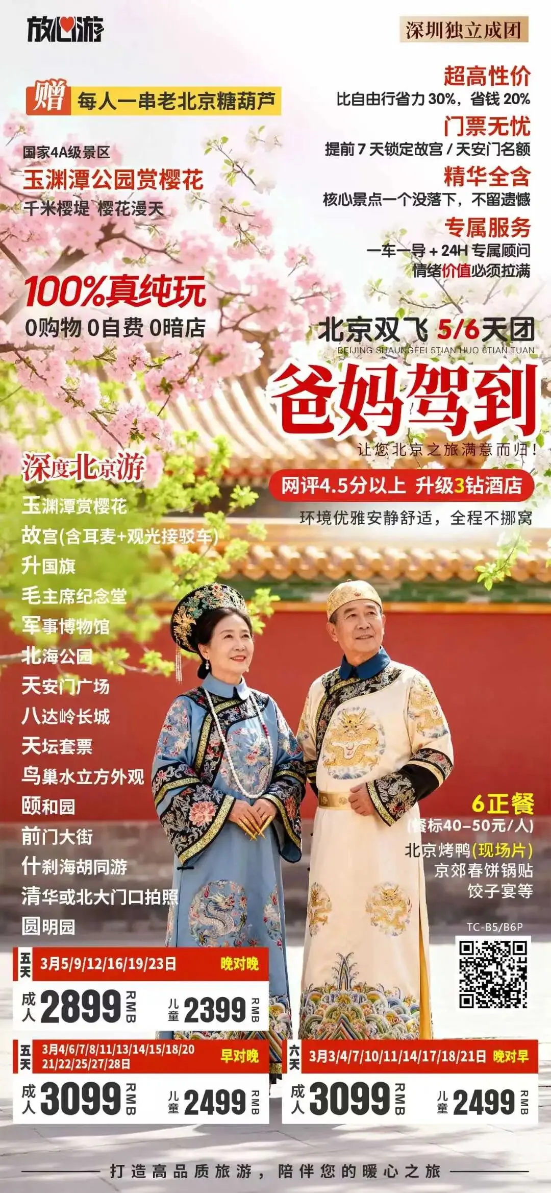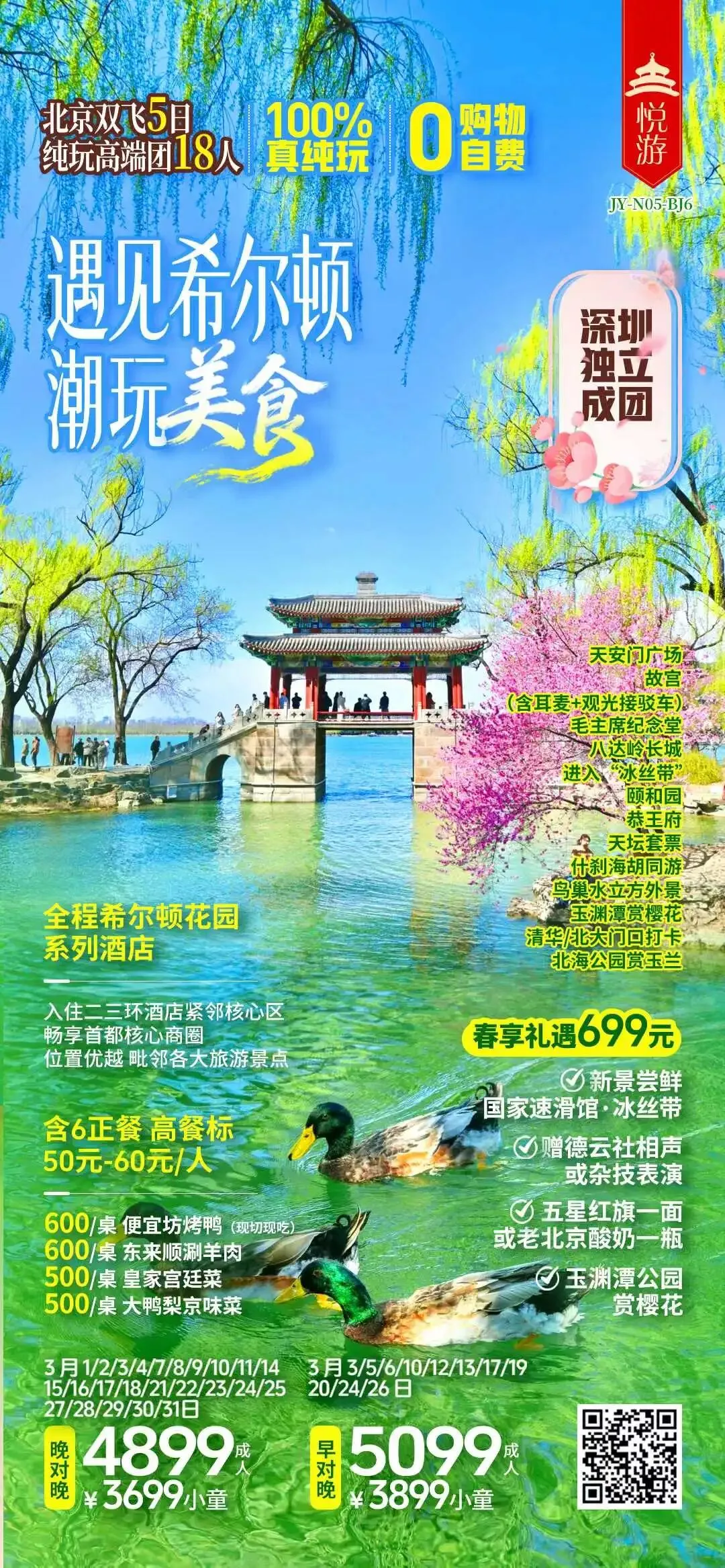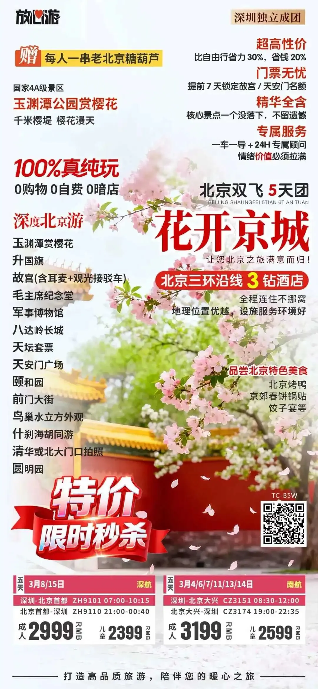 北京旅游|3月深圳出发北京5/6天纯玩团2899起,国旗/故宫/天安门广场/天坛/颐和园/烟袋斜街/圆明园