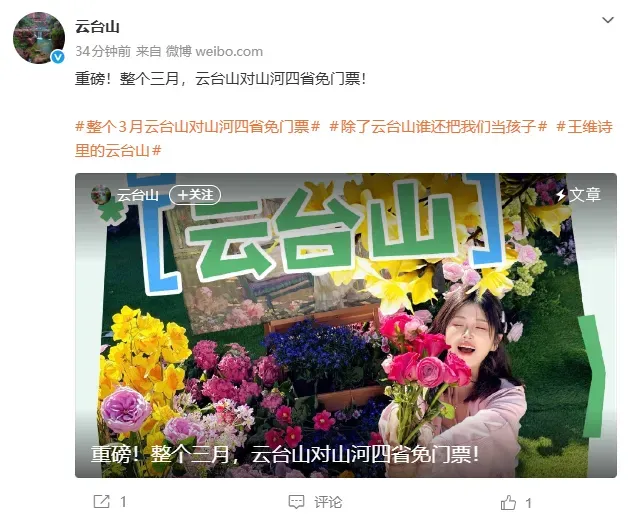 2月25日 河南焦作云台山景区宣布 3月对河南、山西、山东、河北 4个省份免门票 3月1日至3月31日,河南省、山西省、山东省、河北省的游客凭本人身份证原件、暂住证原件、社保卡原件、学生证原件均可享受免景区门票的优惠政策(需另购买60元/人观光车票,门车票自购买之日起连续三日有效)。