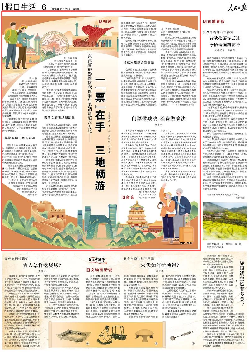 2月23日,人民日报第6版刊发《京津冀旅游景区联票半年多销量超八万张—— 一“票”在手 三地畅游(视线)》。2025年6月,由北京市文化和旅游局、天津市文化和旅游局、河北省文化和旅游厅联合指导,北京文创板发展有限公司市场化运营的京津冀旅游景区联票面向全国正式推出,半年多销量超8万张,带动3亿元的直接与间接消费。