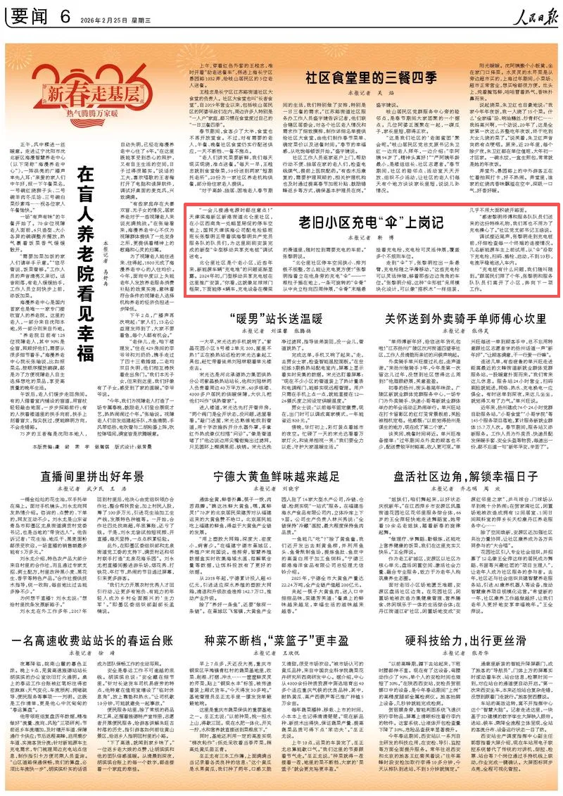 2月25日,人民日报第6版刊发《老旧小区充电“伞”上岗记(新春走基层·热气腾腾万家暖)》。天津滨海新区新港街道北仑里社区,在小区西南角一处略显局促的停车空地上,国网天津滨海公司配电抢修班班长张黎明正带着滨海黎明共产党员服务队的队员们,为这里刚刚安装完成的新型“伞型移动共享充电桩”调试送电。