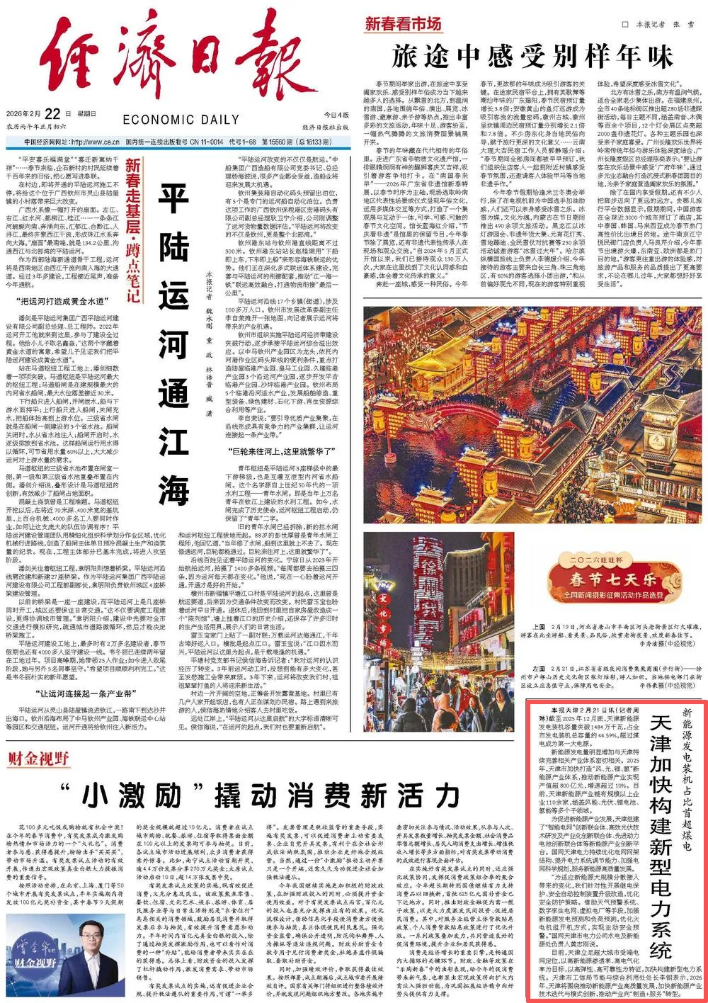 2月22日,经济日报头版刊发《新能源发电装机占比首超煤电 天津加快构建新型电力系统》。截至2025年12月底,天津新能源发电装机容量突破1484万千瓦,占全市发电装机总容量的44.59%,超过煤电成为第一大电源。