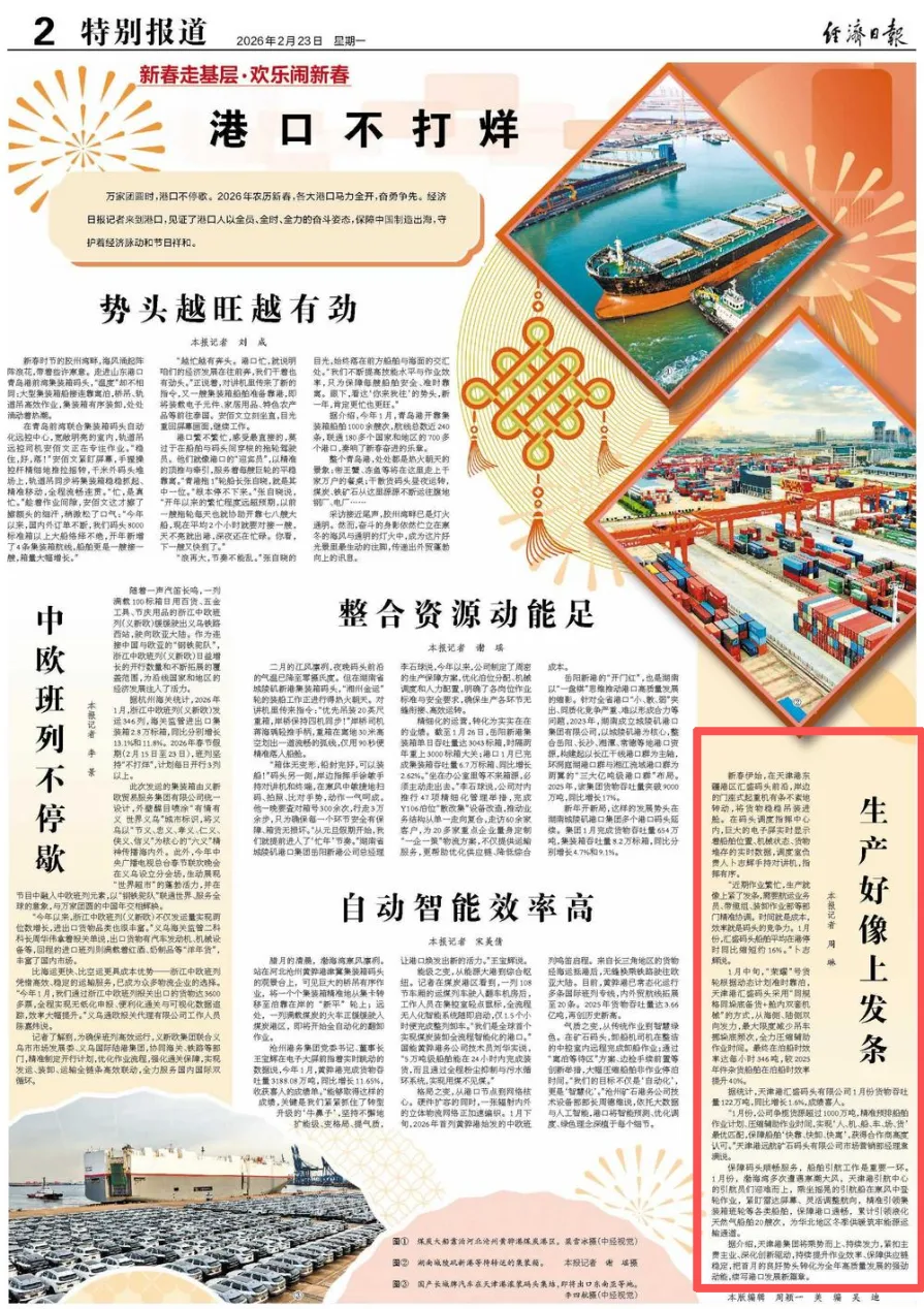 2月23日,经济日报第2版刊发《生产好像上发条》。新春伊始,在天津港东疆港区汇盛码头前沿,岸边的门座式起重机有条不紊地转动,将货物稳稳吊装进舱。在码头调度指挥中心内,巨大的电子屏实时显示着船舶位置、机械状态、货物堆存的实时数据,调度室负责人卜志辉手持对讲机,指挥有序。