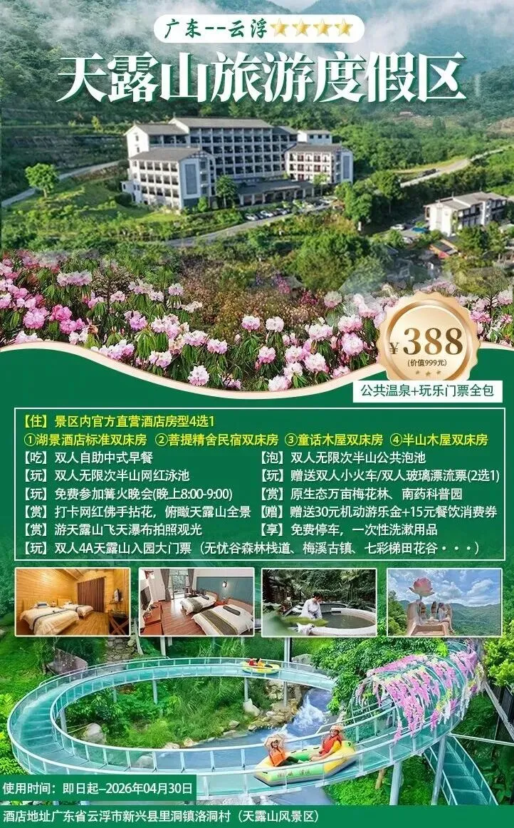 388抢【云浮4A天露山景区】房型3选1+早餐+无限次温泉+半山网红泳池+小火车/漂流+梅溪古镇+梯田花谷、佛手拈花~