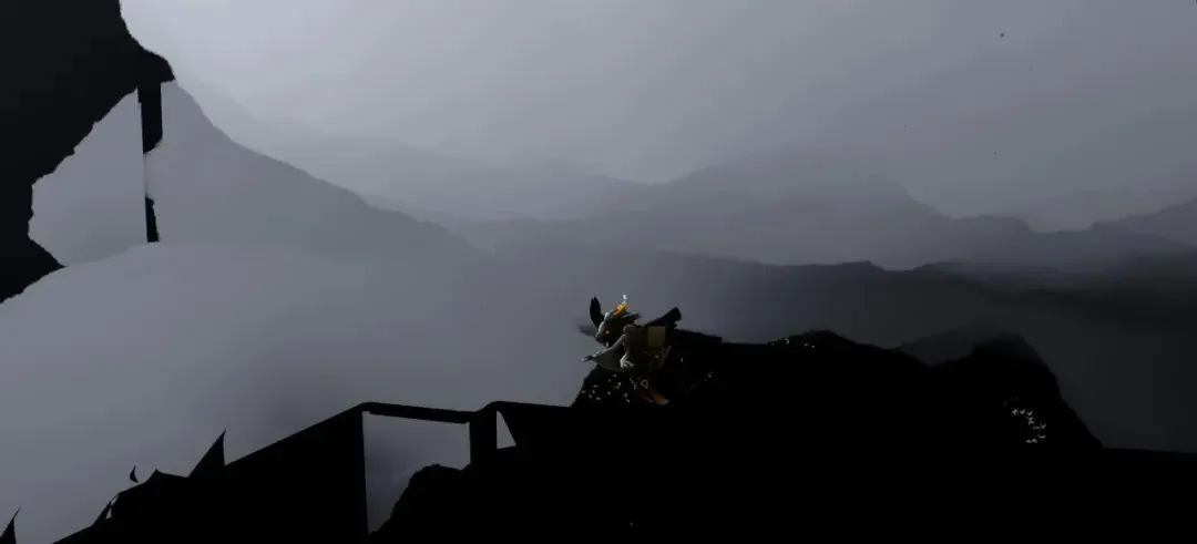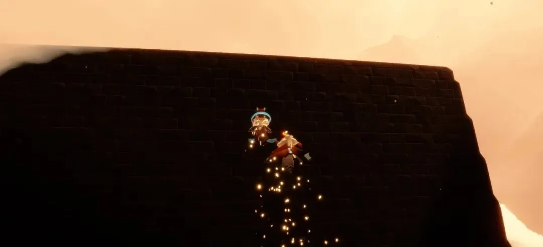 我上图是回头拍的,咱正常往前看是一道墙,咱继续飞到它上边,这次云较多,咱注意尽量往高飞,不然掉下去就又到神殿里了。