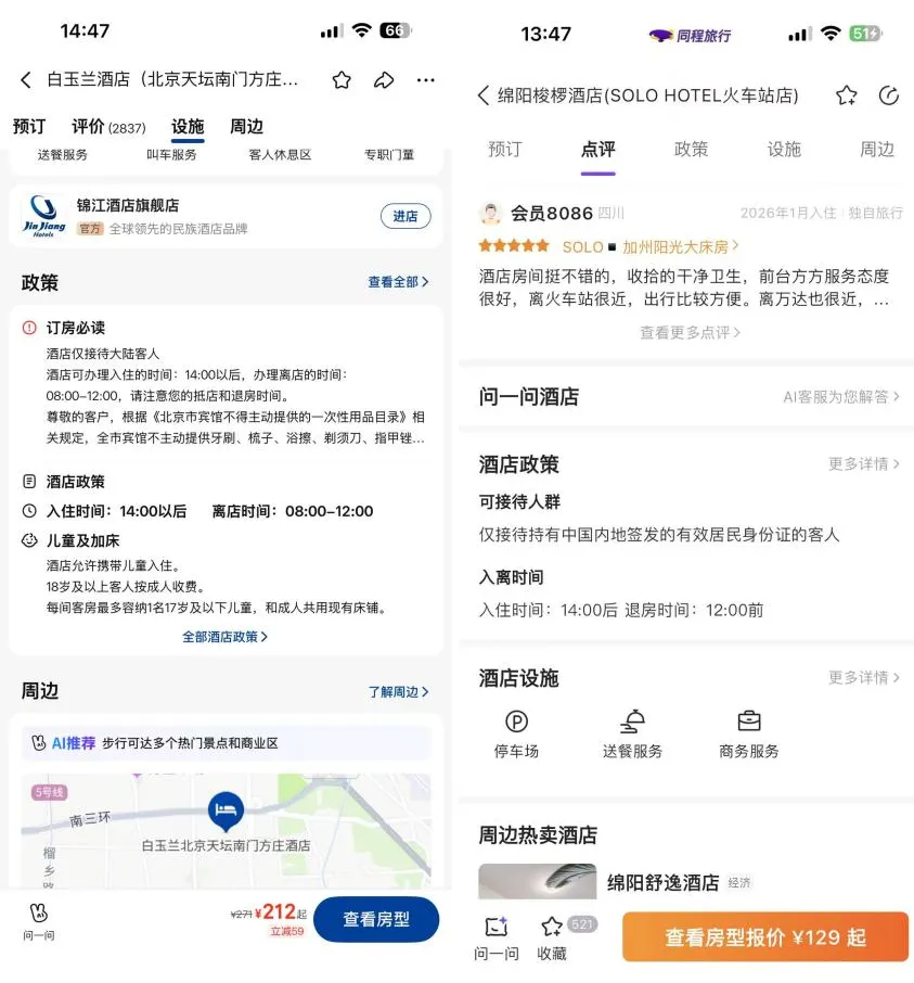 南方都市报曾在2024年报道,来自尼日利亚、英国的外籍旅客反映,部分酒店以「不具备涉外资格」「不知道如何将信息录入系统」为由拒绝其入住,这种情况不止发生在小城市,一线城市也依然存在。在多家OTA平台上,都有不少酒店详情页显示「仅接待持有中国内地签发的有效居民身份证的客人」。