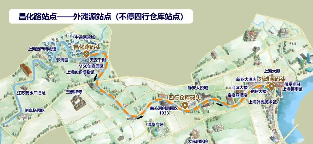 不断优化苏州河旅游航线,以外滩源、四行仓库、昌化路码头为核心节点,先后推出30分钟华政段环线、长风外滩源对开90分钟航线、外滩源60分钟环线等;创新试点“多点停靠、灵活上下”班轮运营模式,推出“外滩源-四行仓库”15分钟单程票种,实现运营效率与客户体验双提升。