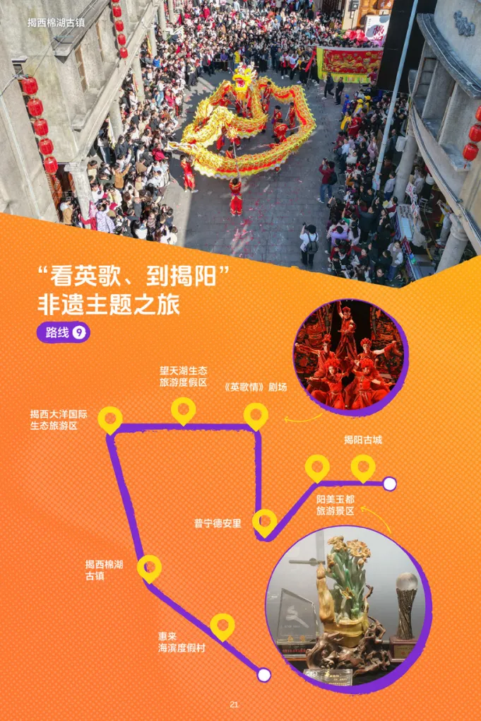 揭阳古城—阳美玉都旅游景区—普宁德安里—《英歌情》剧场—望天湖生态旅游度假区—揭西大洋国际生态旅游区—揭西棉湖古镇—惠来海滨度假村