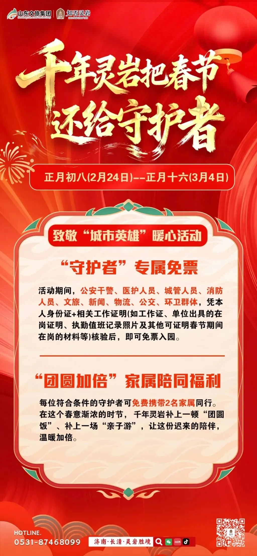 为了向这些春节期间坚守一线的“守护者”致以最诚挚的敬意,山东文旅景区集团正式启动 “把春节还给守护者”公益周活动。从正月初八(2月24日)至正月十六(3月4日),集团旗下13家重点景区将面向全国春节期间在岗的一线工作者,敞开免费大门,并邀请他们的家人一同前往,在春意渐浓的山水之间,补上一场迟来的团圆之旅。
