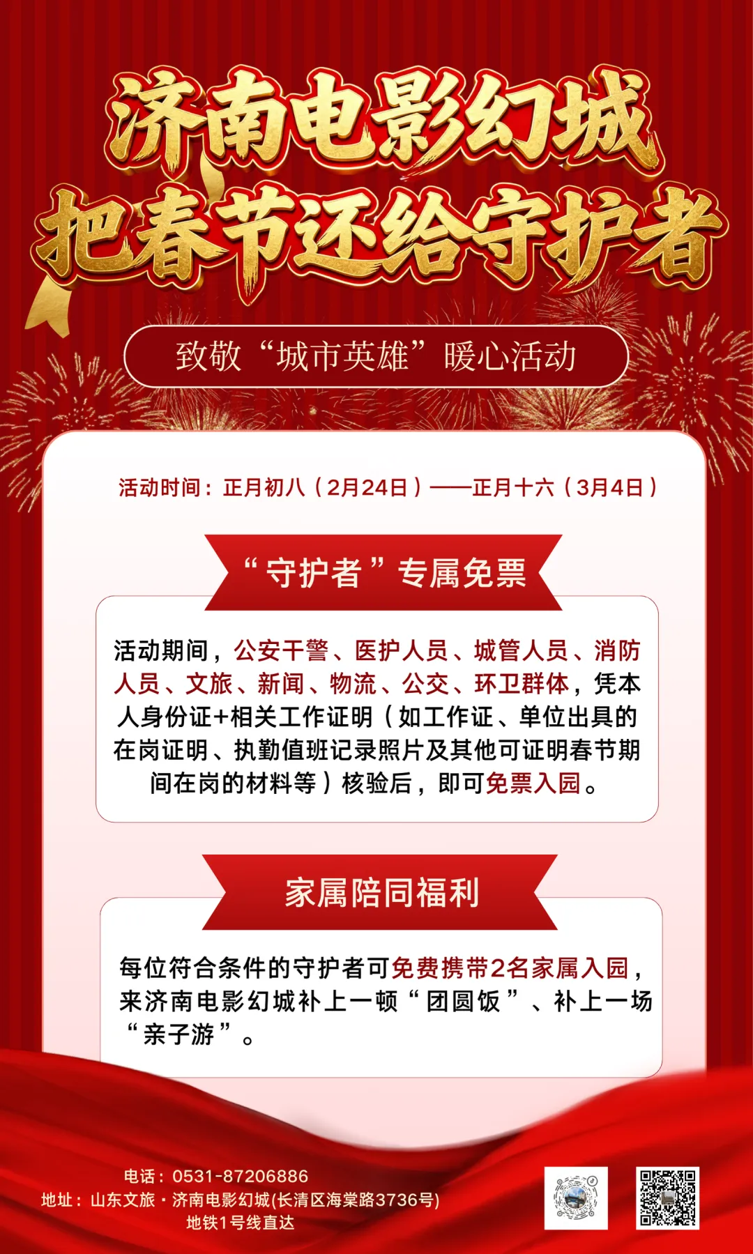 免票人群:春节期间在岗人群,包括但不限于以下行业的一线职工:🚌公共交通保障人员:包括铁路、民航、长途客运司机、地铁及公交驾驶员等保障春运的主力军;🚓公共安全守护者:执勤民警、交警、戍边民警、消防指战员等;🏭能源与民生保供人员:电力工人、自来水厂及燃气公司抢修员、环卫工人、外卖小哥、快递员等;🏥医疗与应急保障人员:春节期间值守的医护工作者、应急救援队伍等;🏠重大项目与基础建设者:春节期间不停工的工程建设者、企业生产一线工人等。