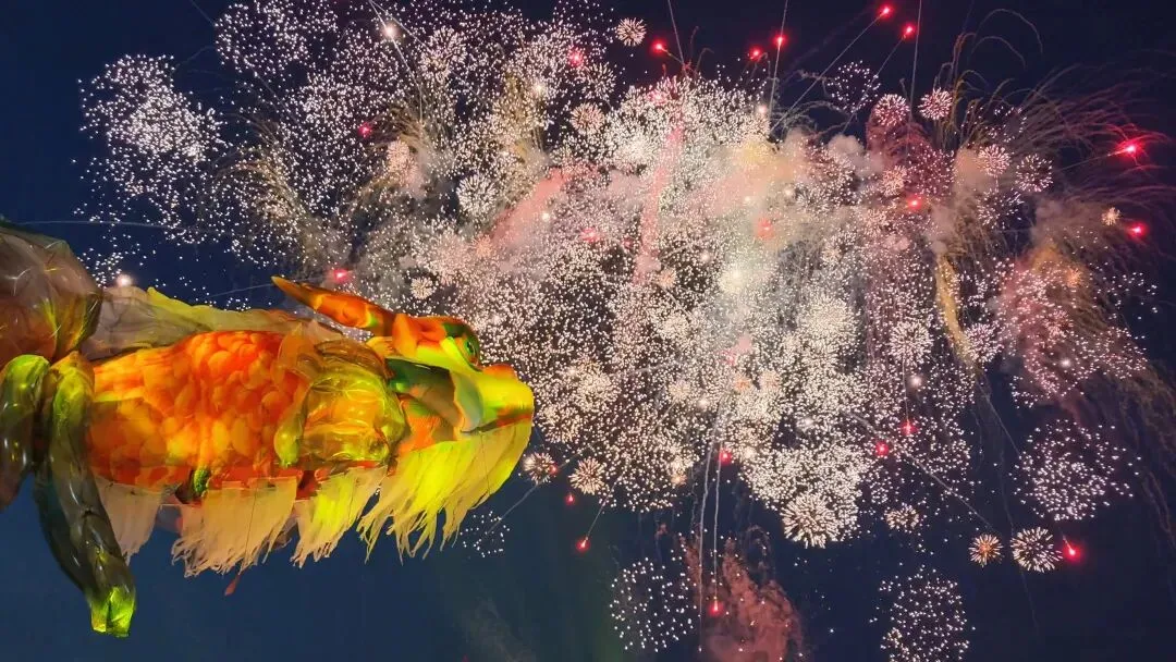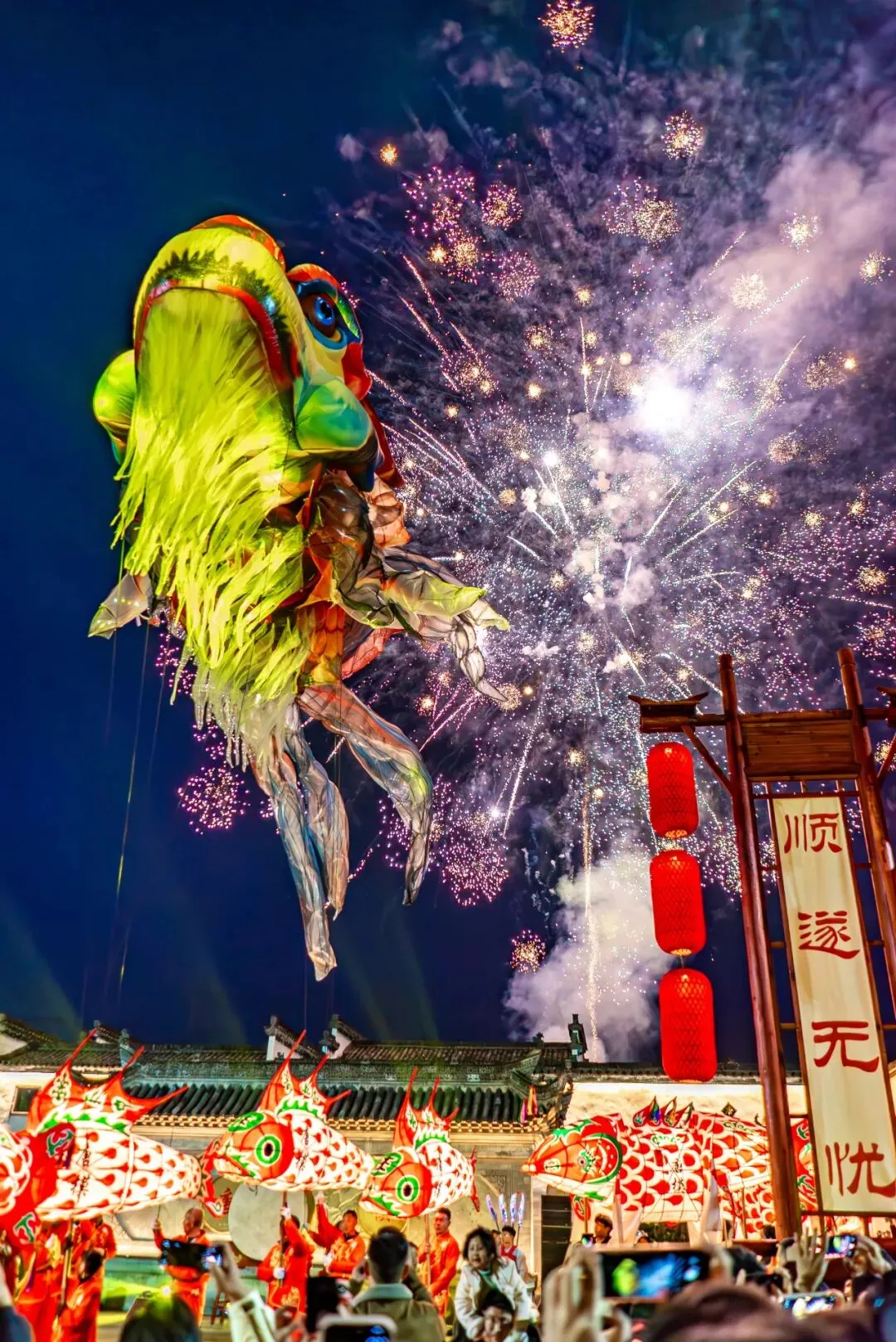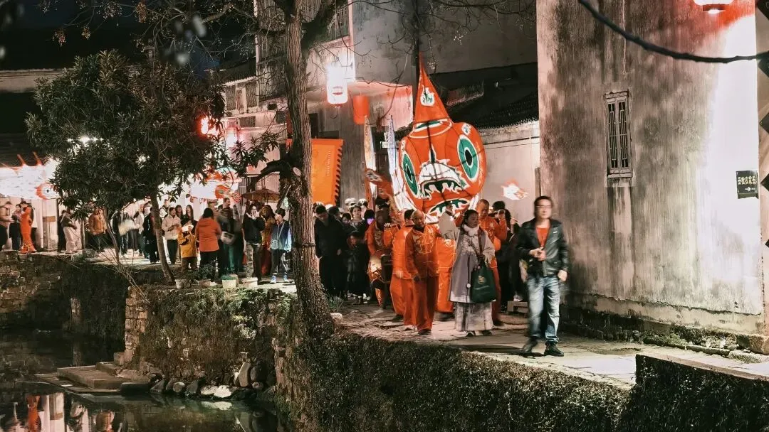 当夜幕降临,《“满池娇”·独占鳌头》节目将气氛推向高潮。鱼灯巡游流光溢彩,更有打铁花、火壶、烟花秀轮番呈现,与古村巷弄、徽派建筑交相辉映,构成一幅天地共舞、如梦似幻的绝美画卷。