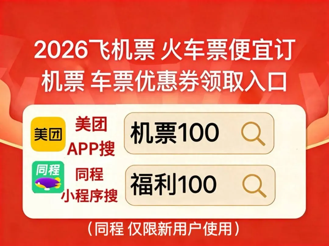 美团APP搜【机票100】低价订机票同程搜【福利100】。2026机票高铁购票攻略:哪个APP订机票便宜?出行机票怎么订便宜?特价机票怎么订?直接去美团APP搜【机票100】同程搜【福利100】领特惠券包,便宜订机票车票啦!