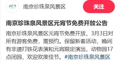 预约入口:南京珍珠泉度假区公众号-点击菜单栏【旅游服务】-【珍珠泉预约购票】-【3月3日预约免费入园】即可预约