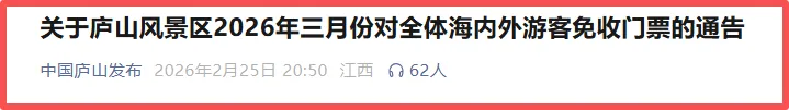 【文旅】黄石游客福利!这一世界风景名胜区3月全域免票,8大畅玩无门槛2月25日 “中国庐山发布”微信公众日发布 《关于庐山风景区2026年三月份 对全体海内外游客免收门票的通告》