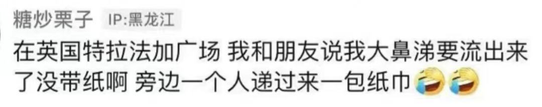 但很难想象同胞相认会是在自己流鼻涕、随口吐槽一句“没带纸”的时候,旁边伸过来一只手、递过来一包纸巾。