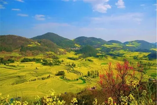 每年2-3月,气温回升至15℃左右时,80多万亩油菜花同步绽放,一望无际的金黄花海中,圆锥形的喀斯特小山宛如孤岛漂浮,站在金鸡峰远眺,天地间尽是治愈的金色,成为中国最早能观赏到的大规模春日花海。这里的春日景观,既是气候温润的馈赠,也是喀斯特地貌与农业种植的完美融合,极具科普与观赏价值。