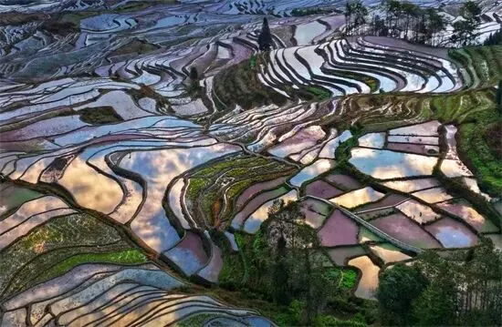 元阳地处云贵高原,降水充沛,哈尼族人顺应山地地形,修建层层梯田,利用山体坡度实现自然灌溉,将水资源合理利用,形成独特的农耕景观。春日里,薄雾缭绕在梯田与哈尼蘑菇房之间,炊烟袅袅,与波光粼粼的梯田相映成趣,既能欣赏到绝美的春日风光,也能读懂人文智慧与自然水文的共生之道。