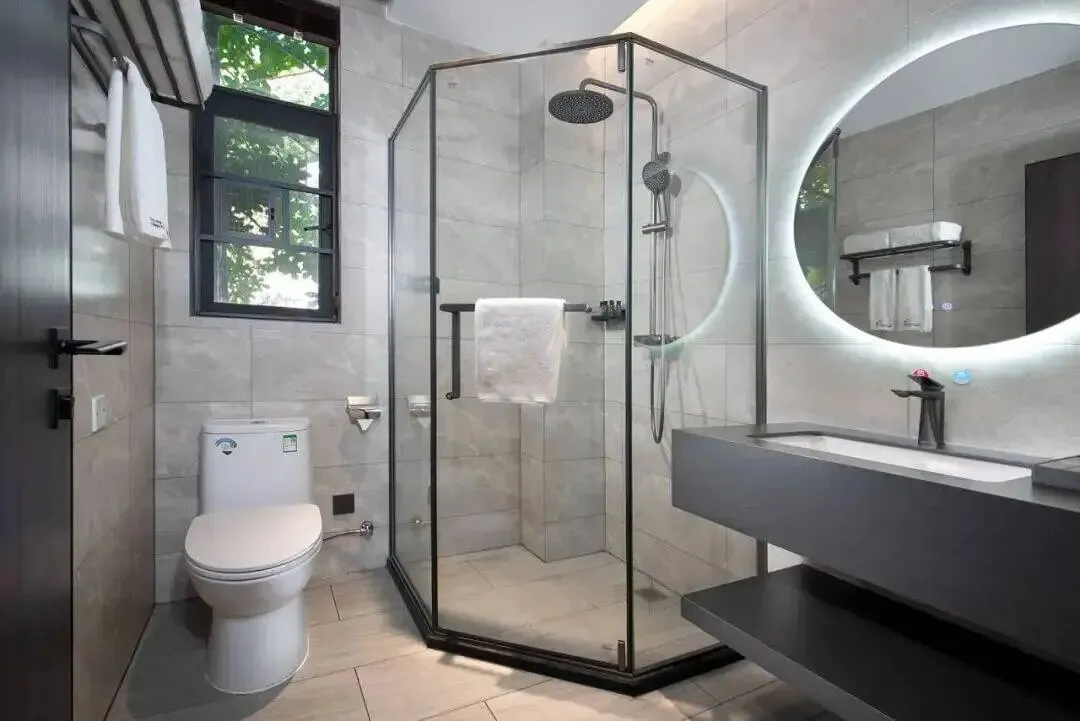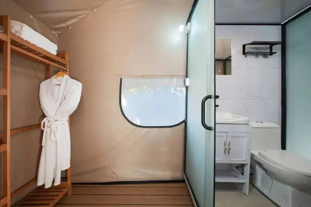 帐篷的一角设有一个小巧的休息区,几把藤编座椅围绕着一张低矮的茶几,另一侧则巧妙地设置了一个小型浴室,虽然空间不大,但设施齐全,热水充足。