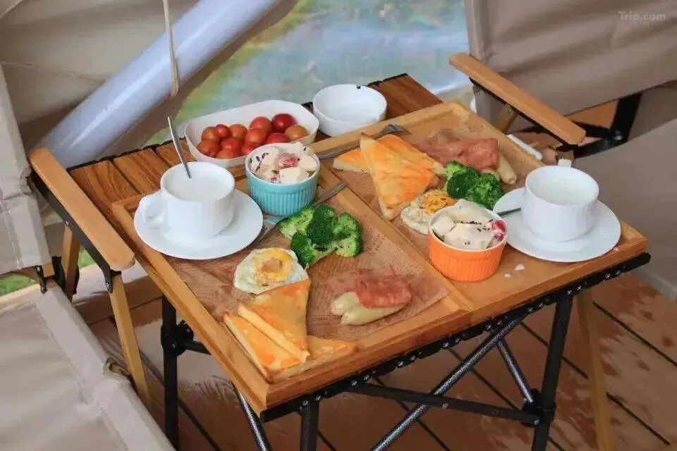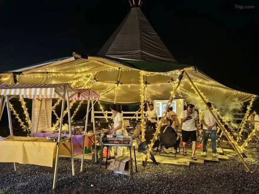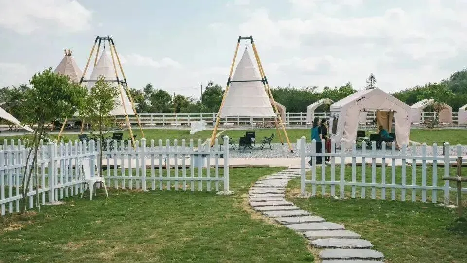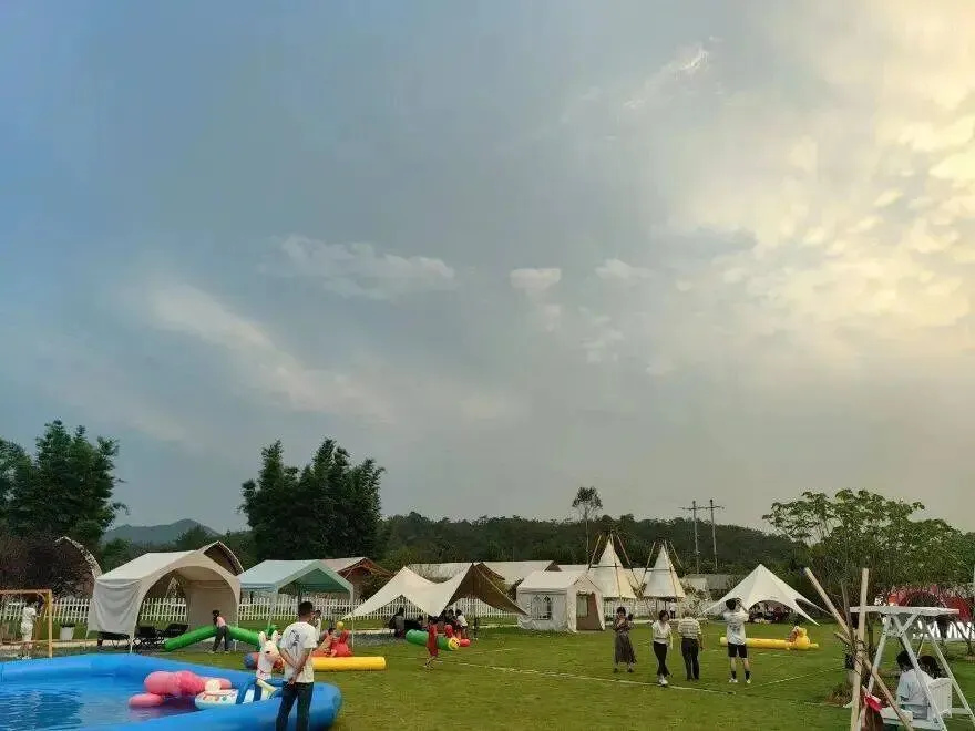 大风门旅游度假村内的大风优幕星空露营,有客家围屋、庄园式露营帐篷、田园天幕、小火车、围炉煮茶等打卡游玩点,还能尝试新中式餐厅品味客家菜。