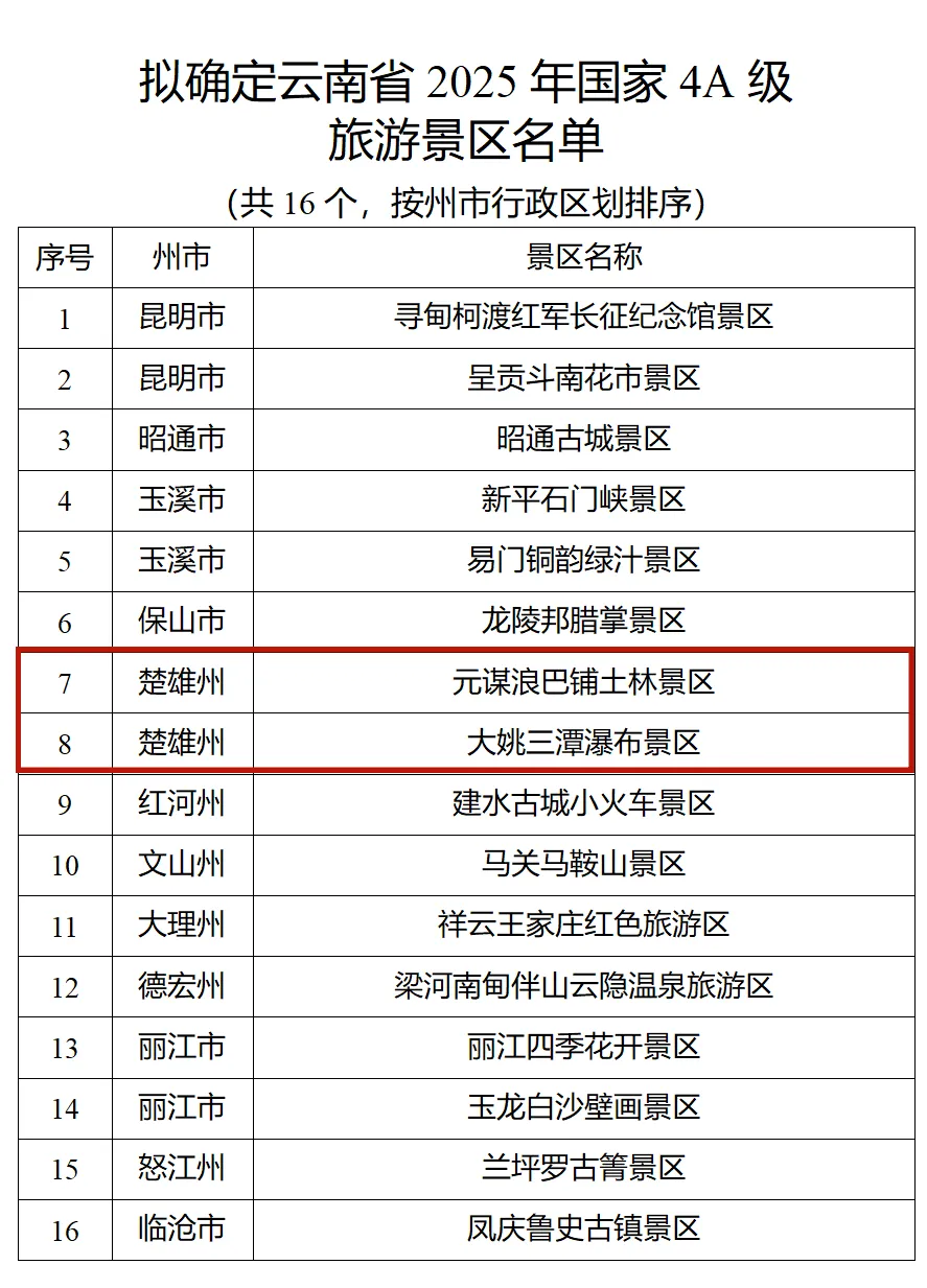 根据《旅游景区质量等级划分》(GB/T 17775-2024)国家标准和《旅游景区质量等级管理办法》要求,经各州(市)文化和旅游局初评、推荐,省文化和旅游厅按程序组织开展了2025年国家4A级旅游景区评定工作,寻甸柯渡红军长征纪念馆景区等16家景区达到国家4A级旅游景区标准,拟确定为国家4A级旅游景区。