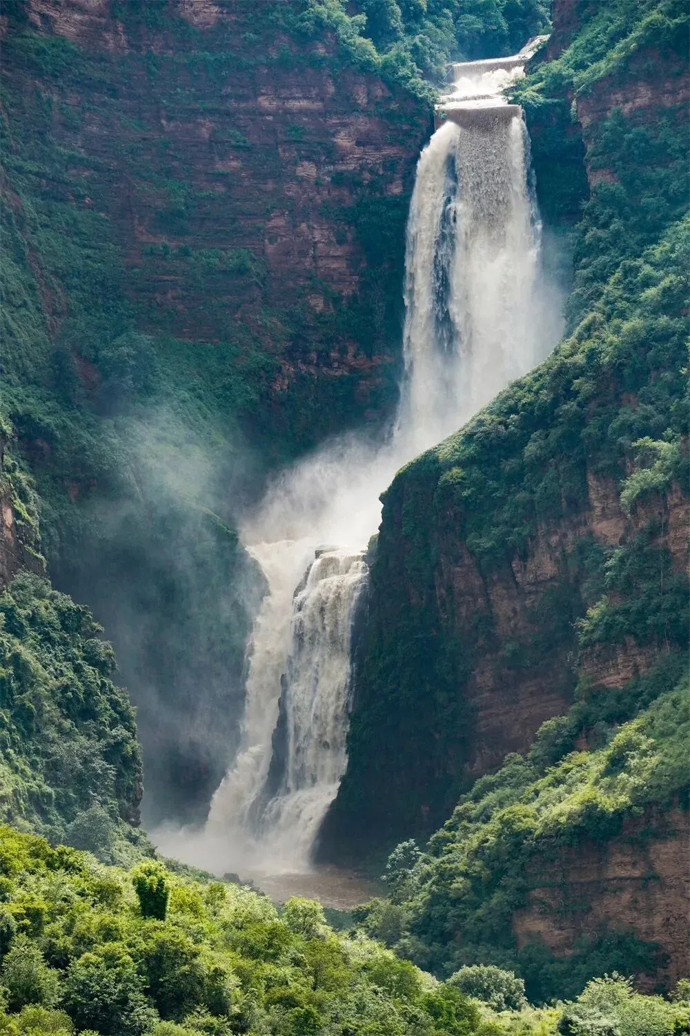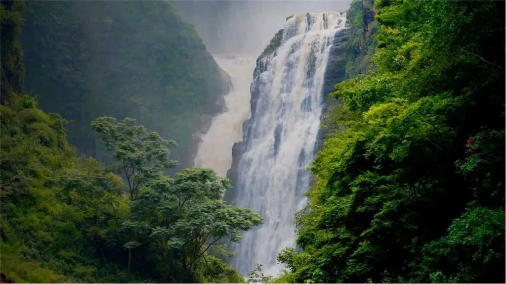 最具看点的三级瀑布,从上至下第一级高19米,第二级高121米,第三级高82米,水流在每级瀑布下方形成一个深邃的水潭,总落差达220.28米,三级瀑布浑然一体,河水沿着断面汹涌飞流而下,如千军万马奔腾,势不可挡。