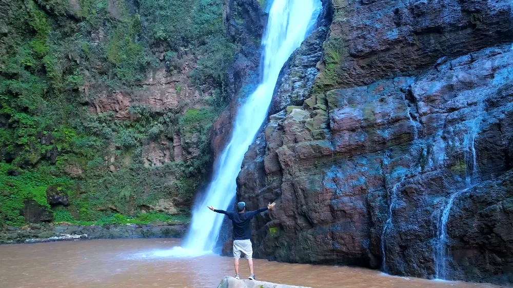 站在观景台举目仰望,眼前的瀑布气势恢宏,巨大的水流从天而降,沿着悬崖飞流直下,多级瀑布自然连缀,一气呵成,仿佛直接飞入眼眶,强烈地撞击着视觉神经,撼人心魄。