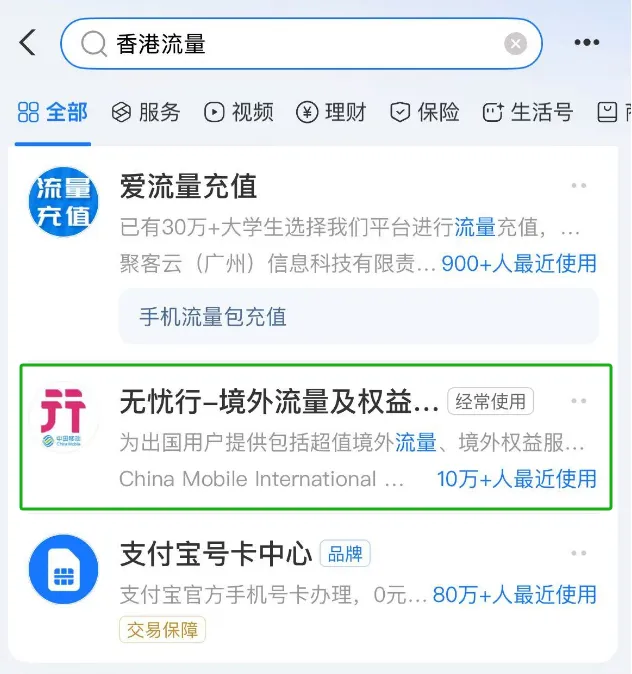 除了港澳通行证,进入香港前,还要提前备好流量卡,这个可以在“支付宝”上搜索“香港流量”,按需选择就成;