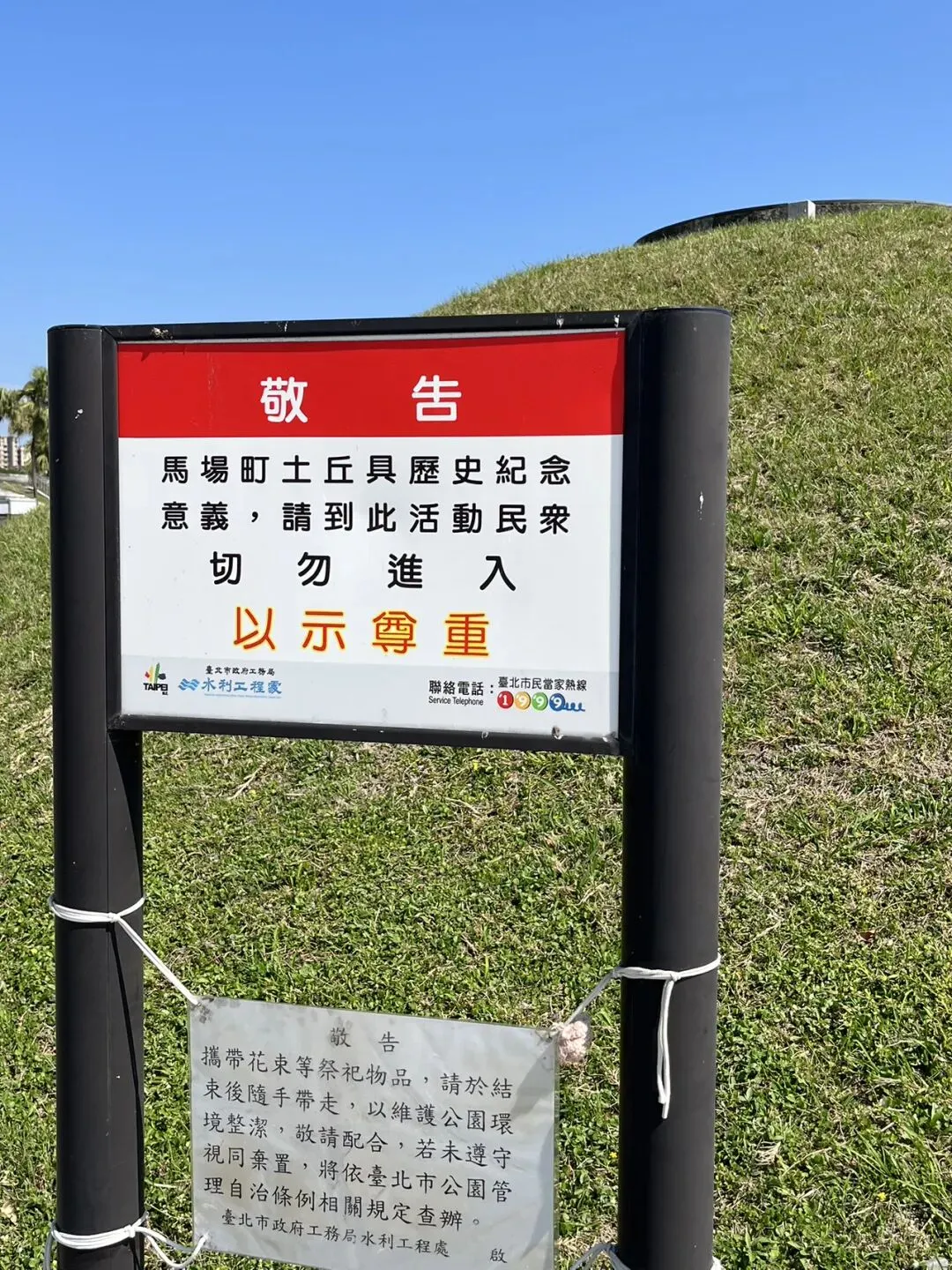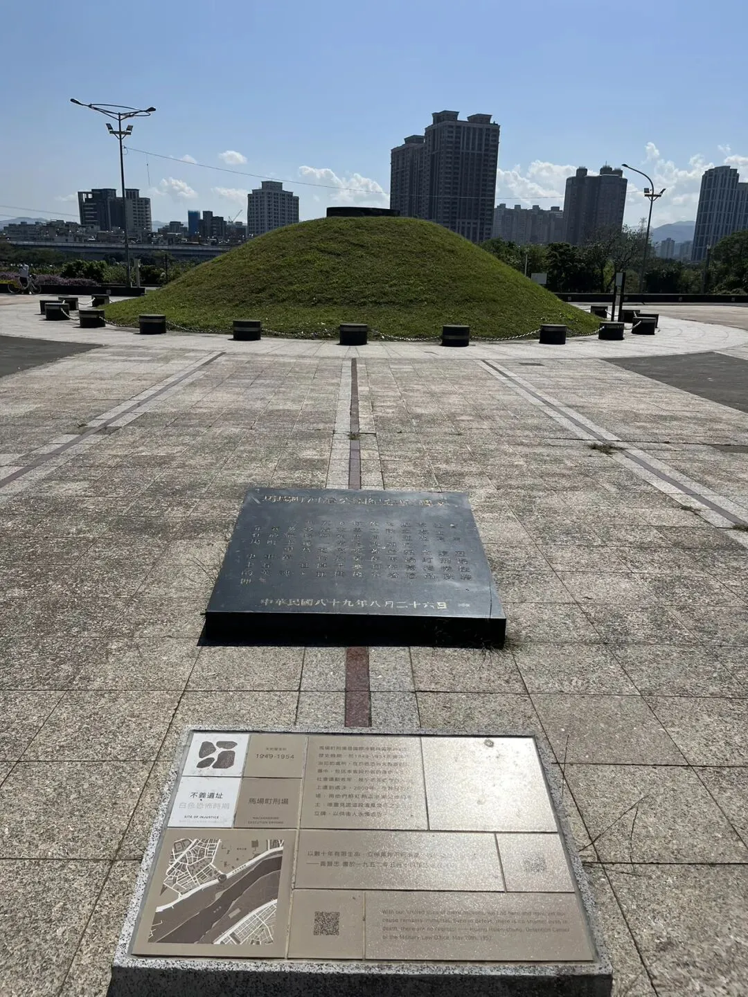 图:公园核心景观为刑场遗留的土丘。据统计,白色恐怖时期在马场町被处决的政治犯达千余人。行刑后,马场中间会留下血迹,需用土覆盖,日积月累形成一座土丘。也就是说,这座土丘是为掩埋历年处决积血而形成的!如今的土丘成了历史的无声见证,象征对历史的铭记和反思