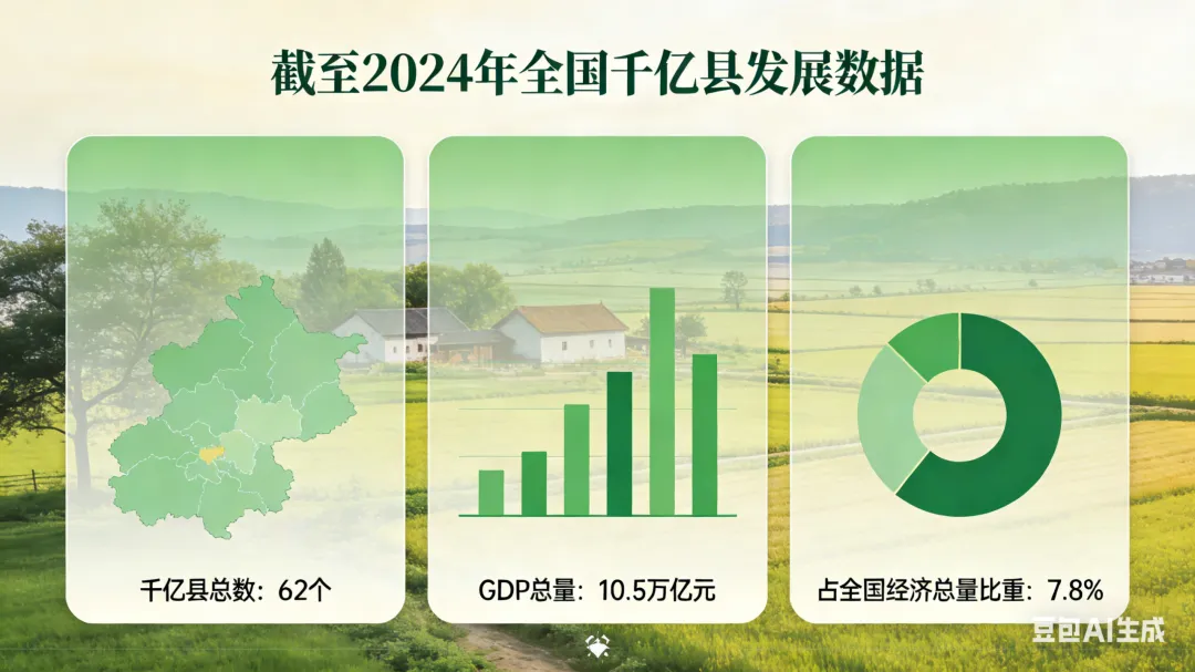 先看几组数据:截至2024年,全国千亿县总数达62个,GDP总量10.5万亿元,占全国经济总量比重7.8%,比整个浙江省还高。