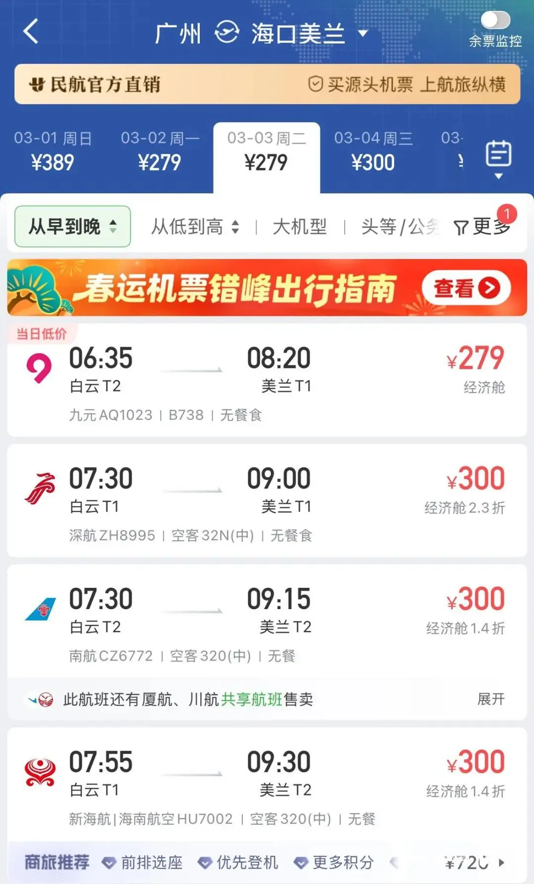 航旅纵横民航官方直销平台数据显示,广州-海口、广州-成都、广州-武汉、北京-西安、北京-琼海、北京-武汉、上海-重庆、上海-长沙、上海-北海、上海-成都、上海-海口、北京-三亚等多条热门航线,均有300元左右机票在售,为错峰旅客带来出行实惠。