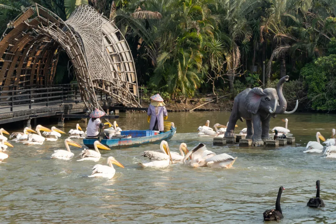 在这里,能近距离邂逅孔雀、鹈鹕、火烈鸟等可爱生灵。东南亚风情的景致,竹结构建筑与绿植相映成趣。春节期间来逛园区、看上鹈鹕“吃播”,度过一段治愈又欢乐的时光吧。