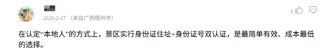 姚华认为,在认定“本地人”的方式上,景区实行身份证住址+身份证号双认证,是最简单有效、成本最低的选择,不仅能精准覆盖户籍相关本地人群,还能兼顾在外工作但身份证号为本地的老乡群体,让这类人群感受到家乡的温情,契合大众对“本地人”的情感与文化认同。从景区经营角度而言,经双认证覆盖的在外老乡群体,享受优惠后到景区打卡,并在朋友圈等平台自发分享,能形成良好的口碑传播,为景区带来更多客流,实现情感温度与经营效益的双赢。