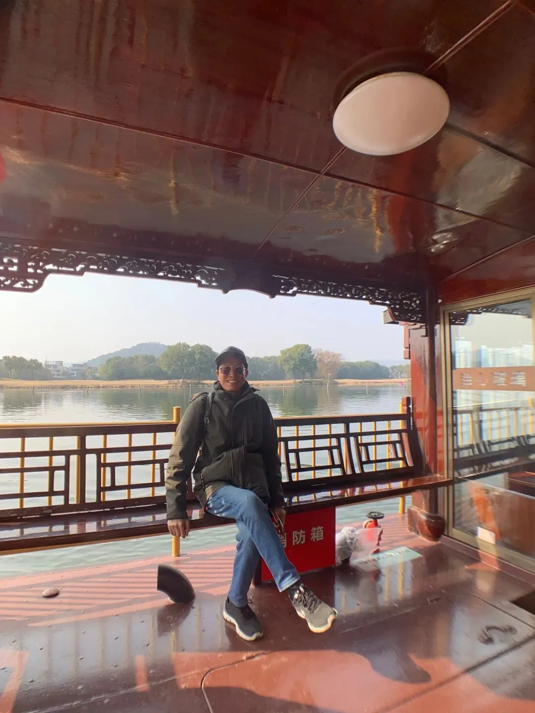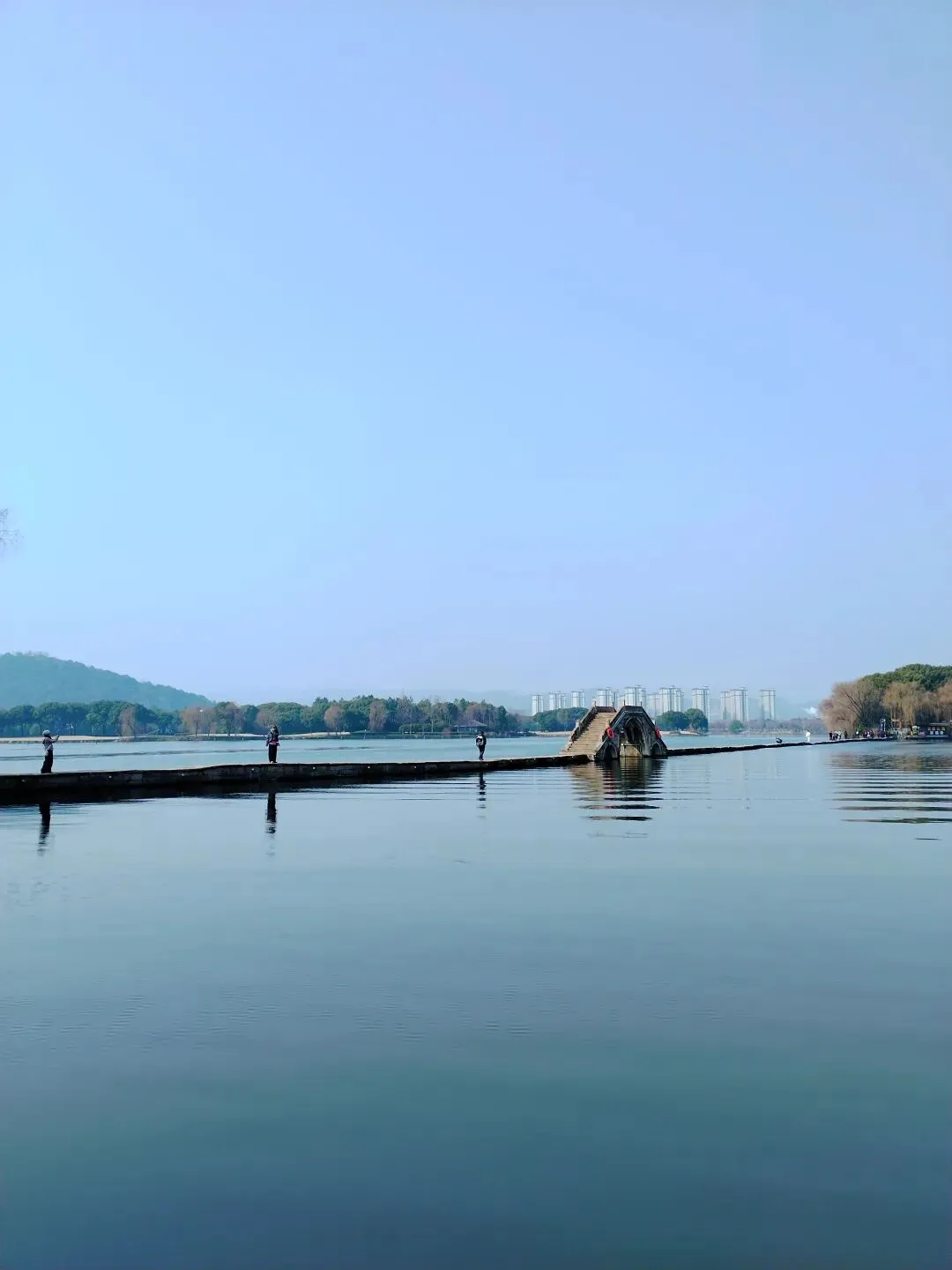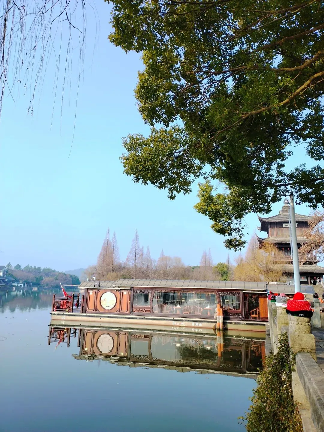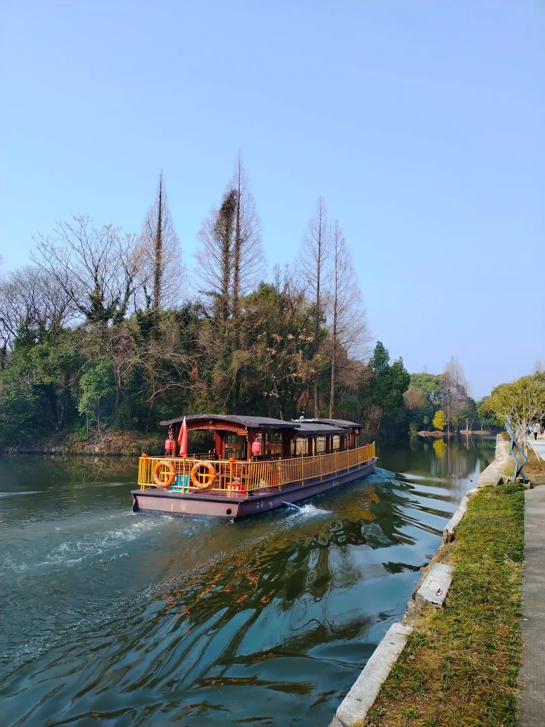 乘上游船,告别鲁镇,我们向着鉴湖驶去。鉴湖,古称镜湖,相传因黄帝铸镜于此而得名,作为浙江省级风景名胜区,更是绍兴的“母亲湖”。湖水澄澈碧绿,似一块温润的翡翠镶嵌在大地,湖面宽阔浩渺,泛舟其上,微风拂面,波光粼粼的湖水漾起层层涟漪。近看碧波映影,远观青山叠翠,舟行其间,宛若人在镜中游,山水相映的画卷在眼前徐徐展开。