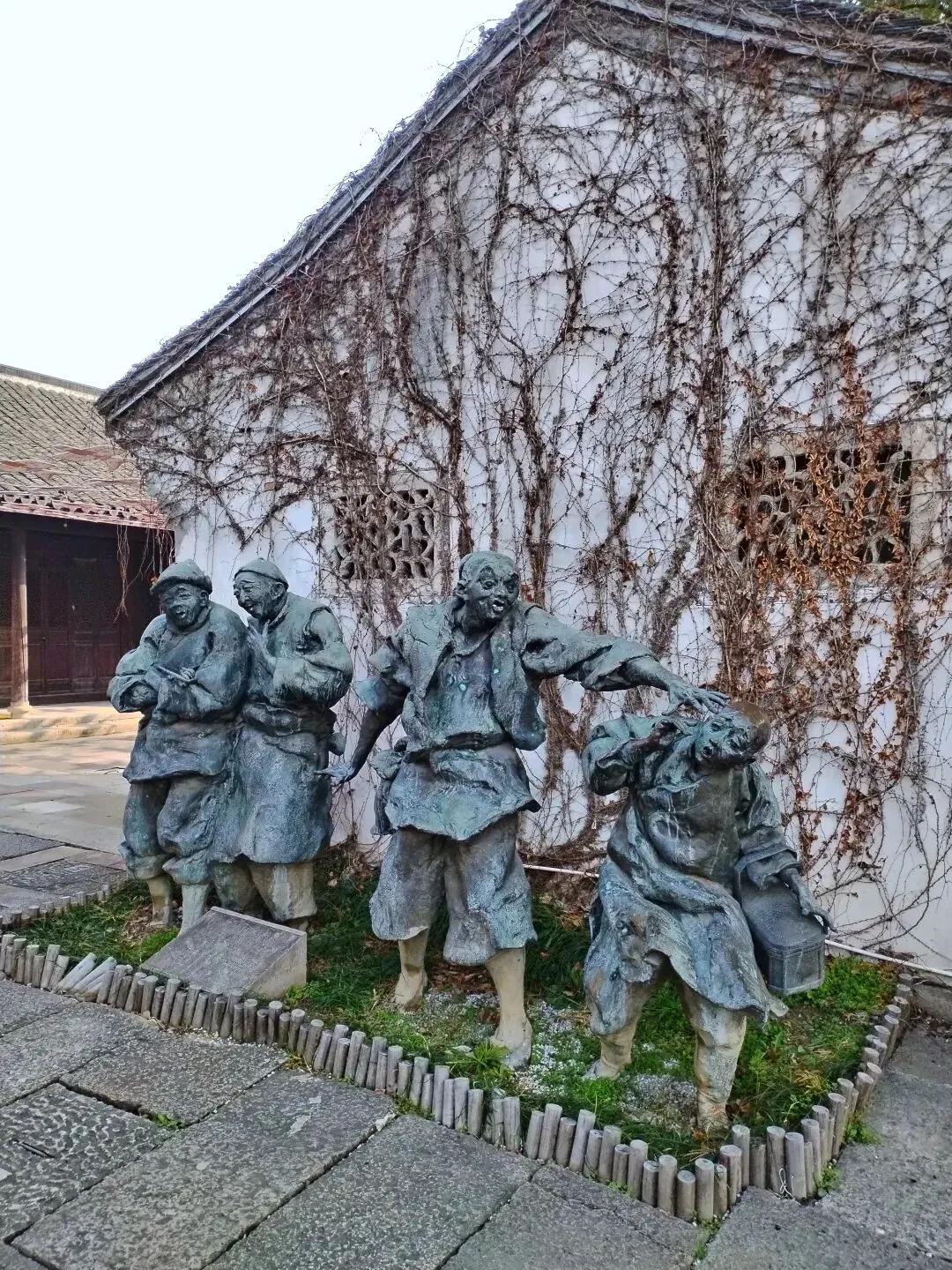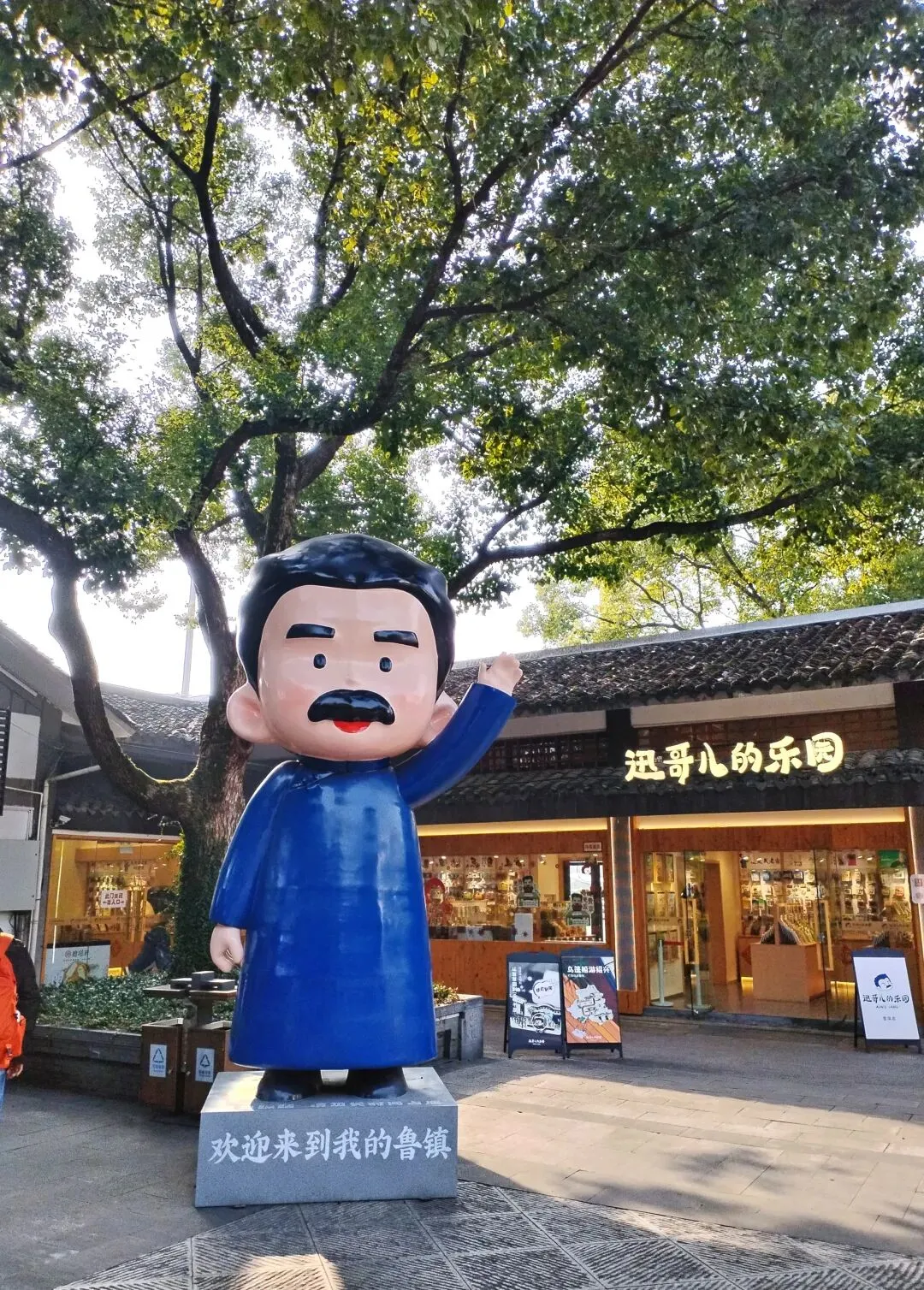 重游故地,却有全新的心境与发现。我们的旅程从鲁镇启程,一步踏入青石板路,便仿若穿越时空,置身于鲁迅笔下的江南水乡旧时光。街边错落着栩栩如生的鲁迅作品人物雕塑,或立或坐,或蹙眉沉思,或笑语盈盈,仿佛将文字里的故事具象化,默默诉说着那个时代的人间百态。