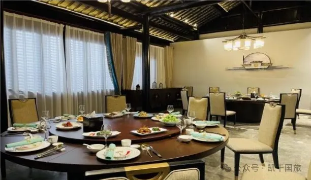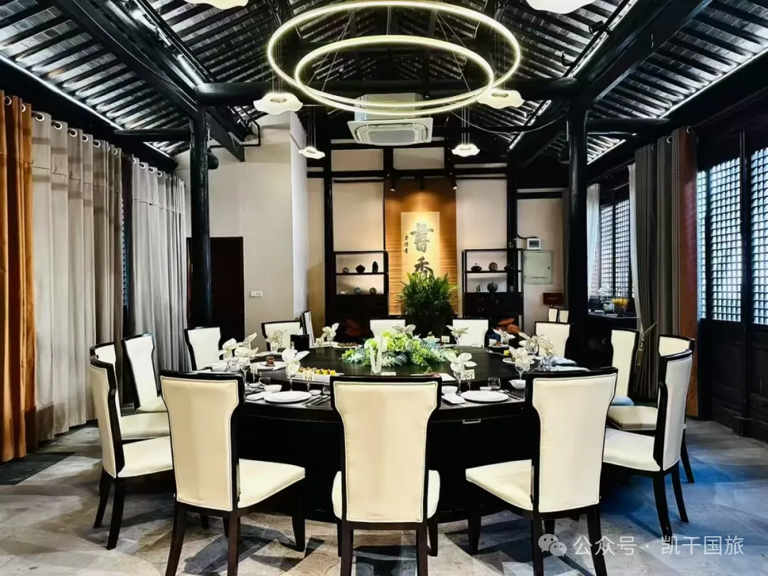 中式风格的客房细节满满,床头有真花装饰、手写迎客词,衣橱内备有备用被子,卫生间干湿分离。部分房型还能欣赏到园林或古镇景观,让住客在雅致中感受江南韵味。