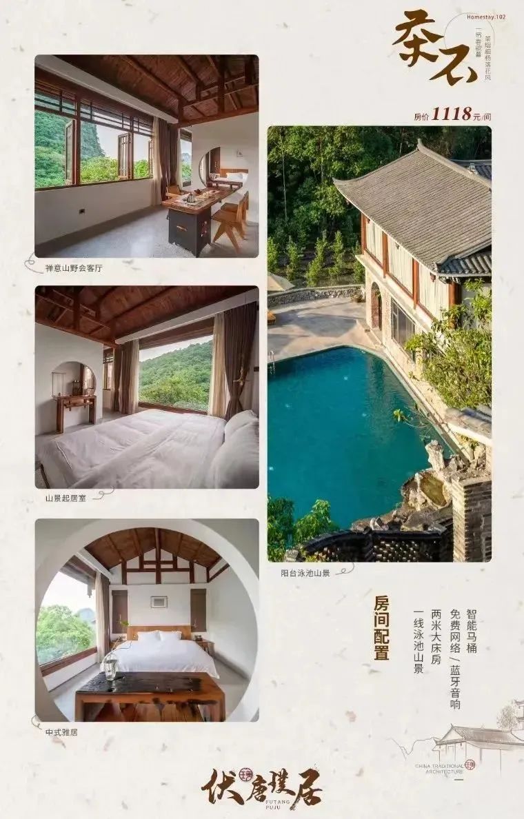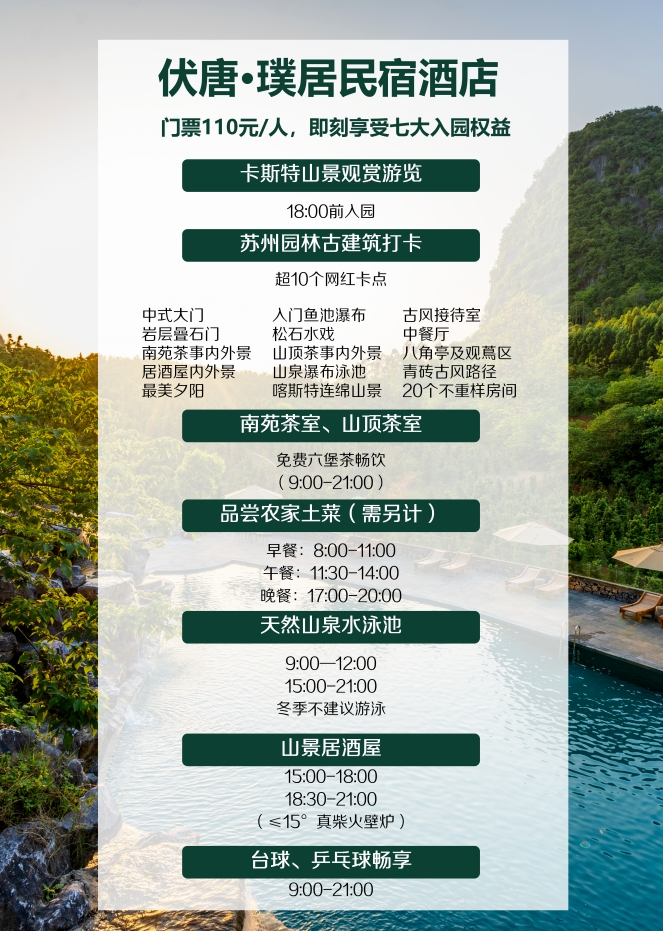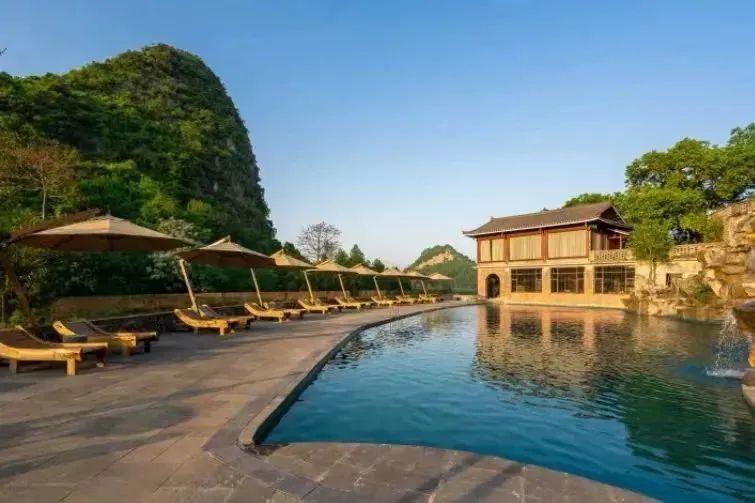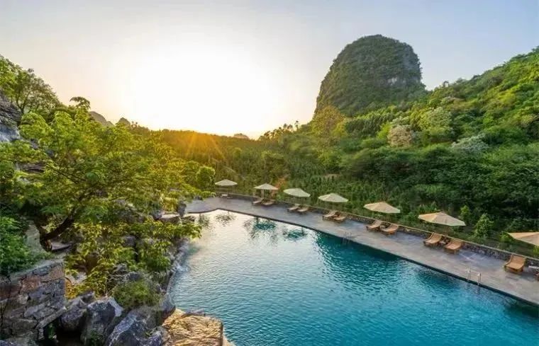 √ 畅游山泉水景观泳池,享戏水乐趣,观峰林日落,与山野自然同呼吸。