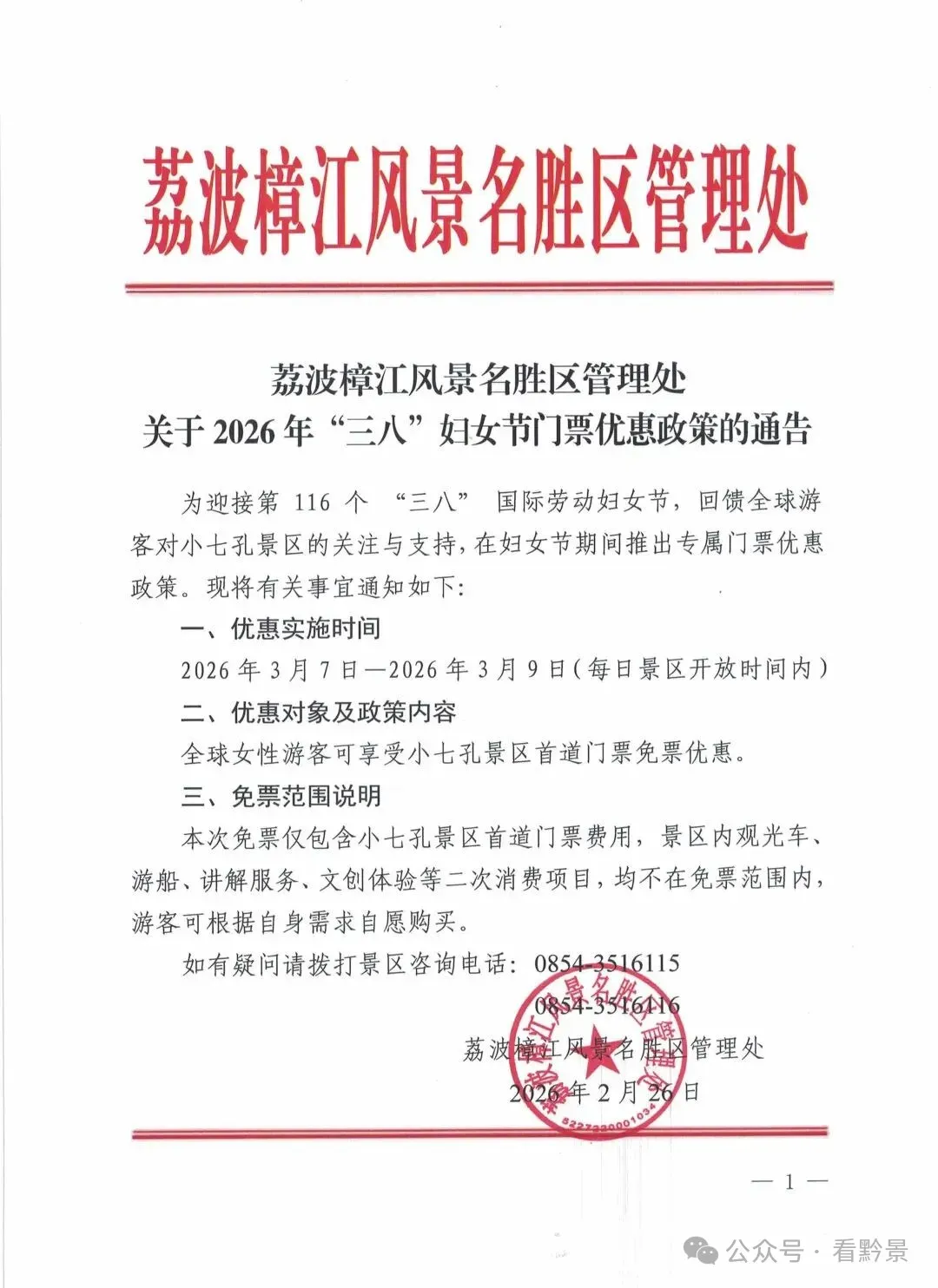 为迎接第 116 个 “三八” 国际劳动妇女节,回馈全球游客对小七孔景区的关注与支持,在妇女节期间推出专属门票优惠政策。现将有关事宜通知如下: