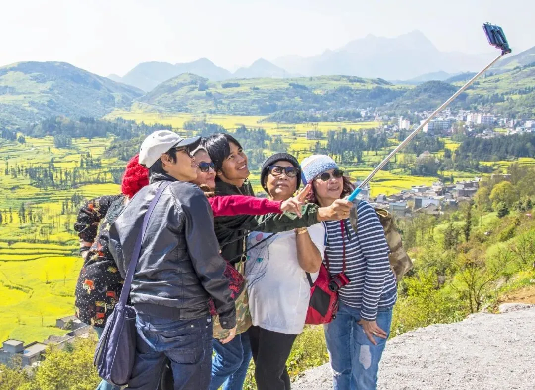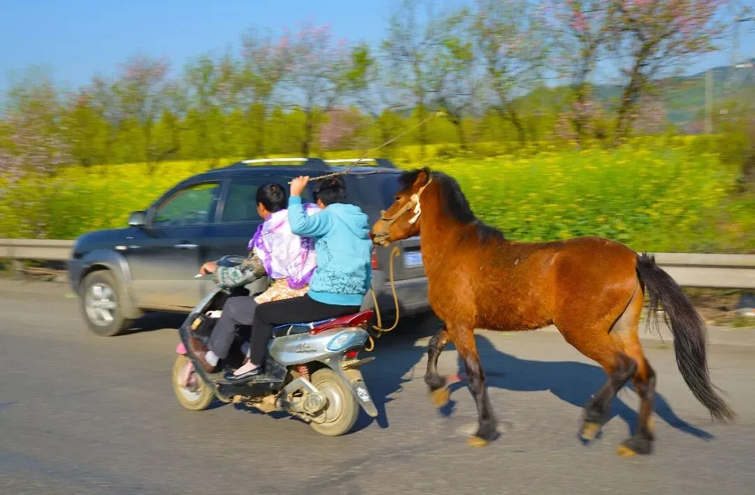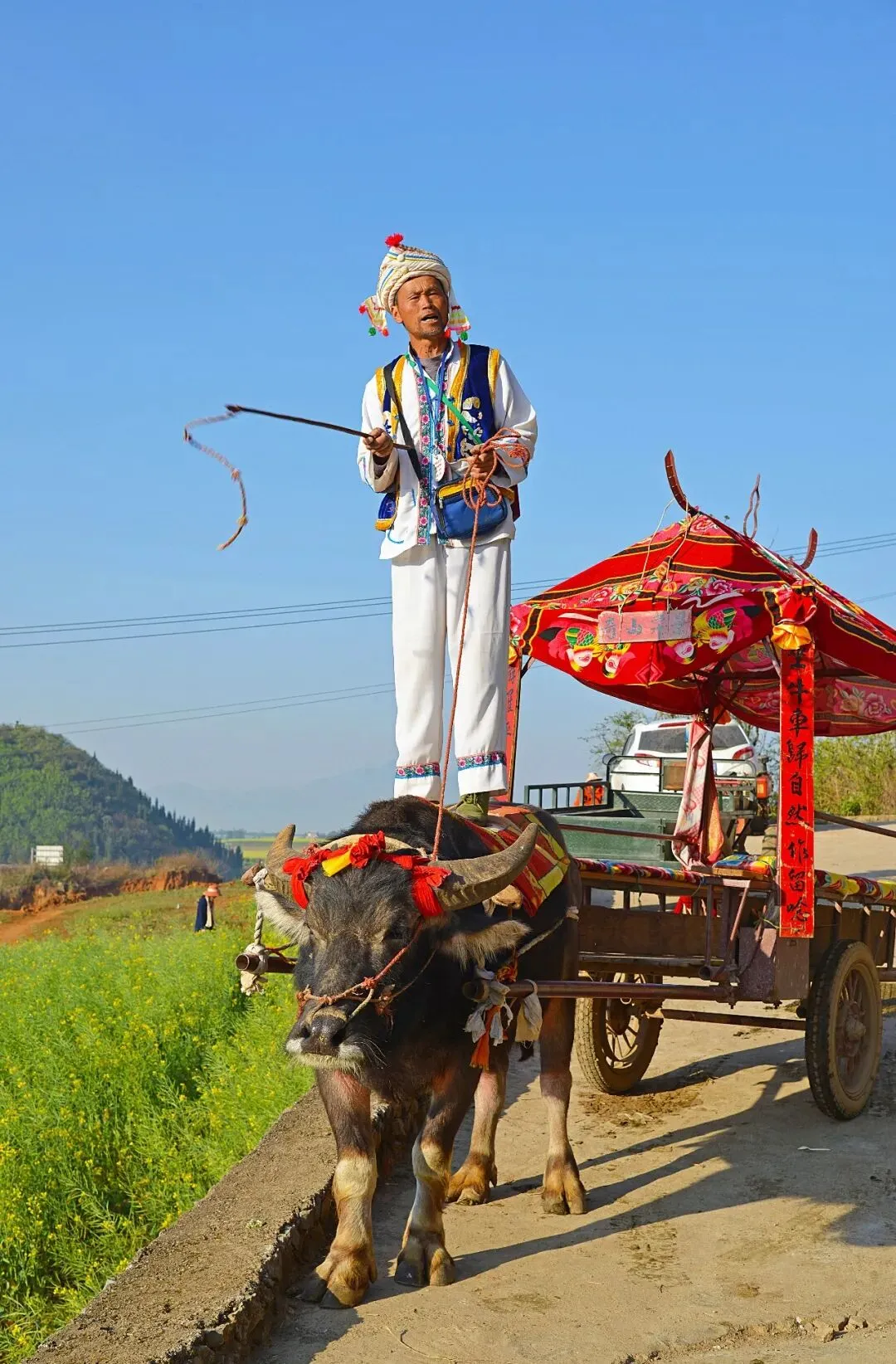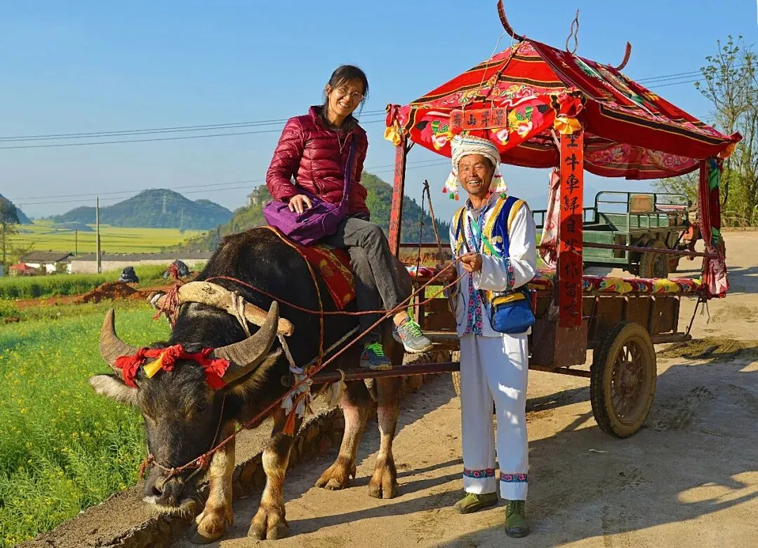 金鸡峰下,乘坐身穿布依族等民族服装的赶牛人,唱着民歌,慢悠悠地在油菜花田中徜徉。芬芳的花香就围绕着你,时间可以这样悠闲渡过。